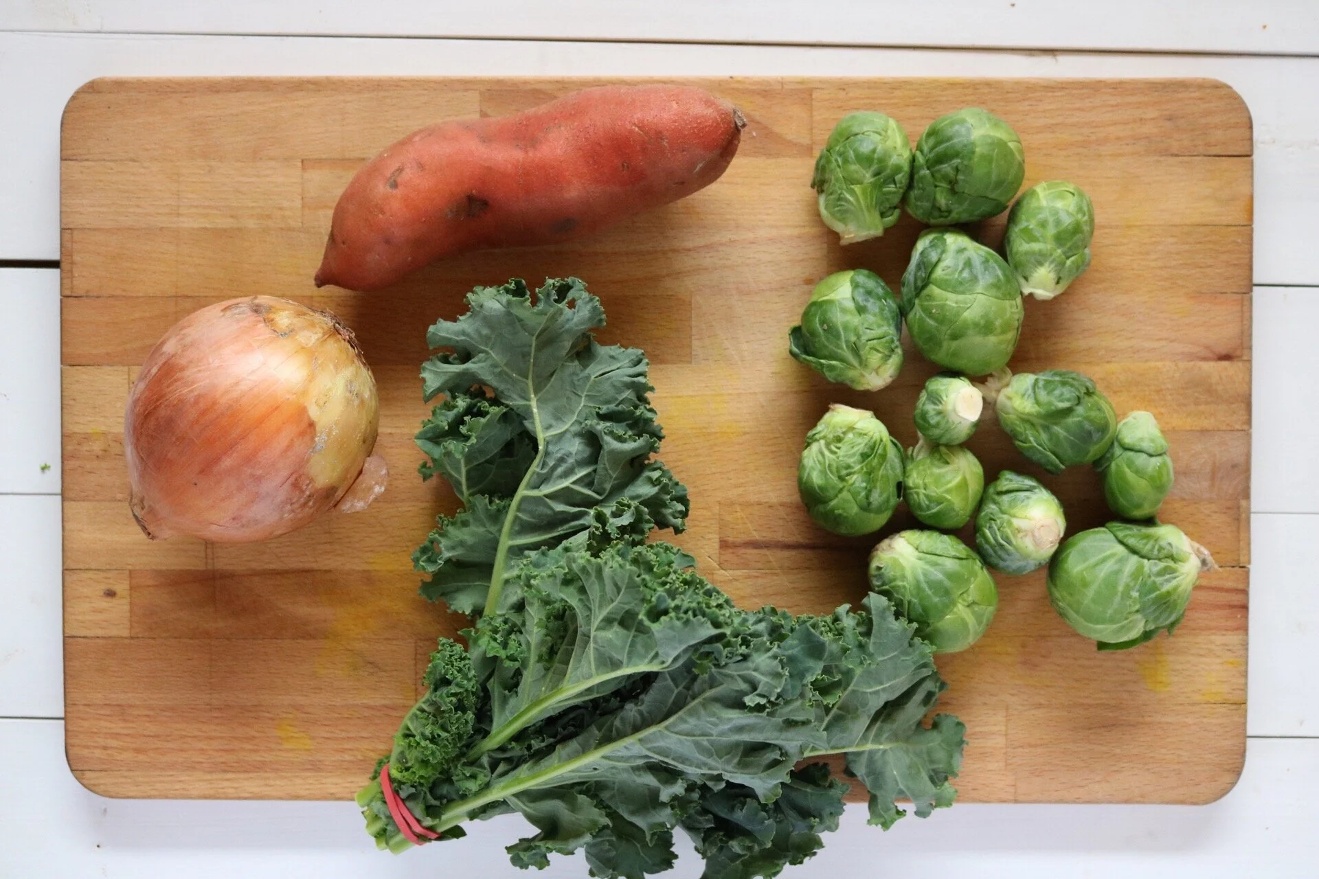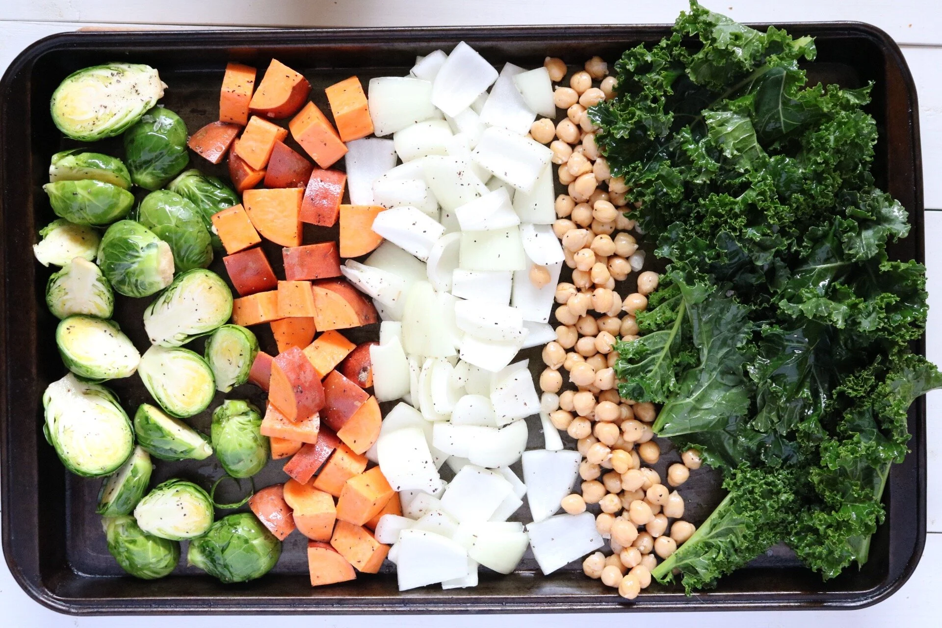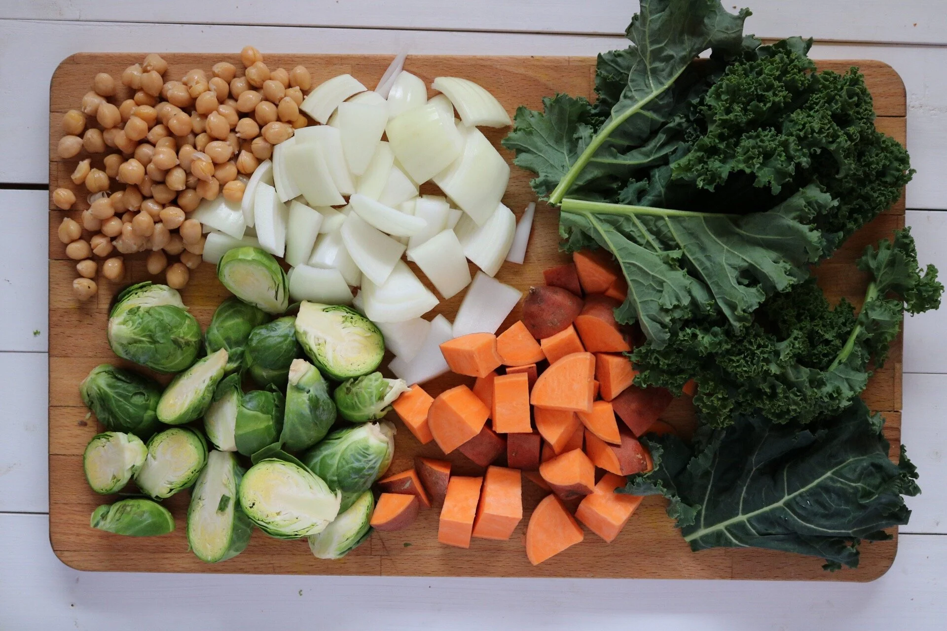 ingredients: onion, kale, sweet potato, brussels sprouts, chickpeas