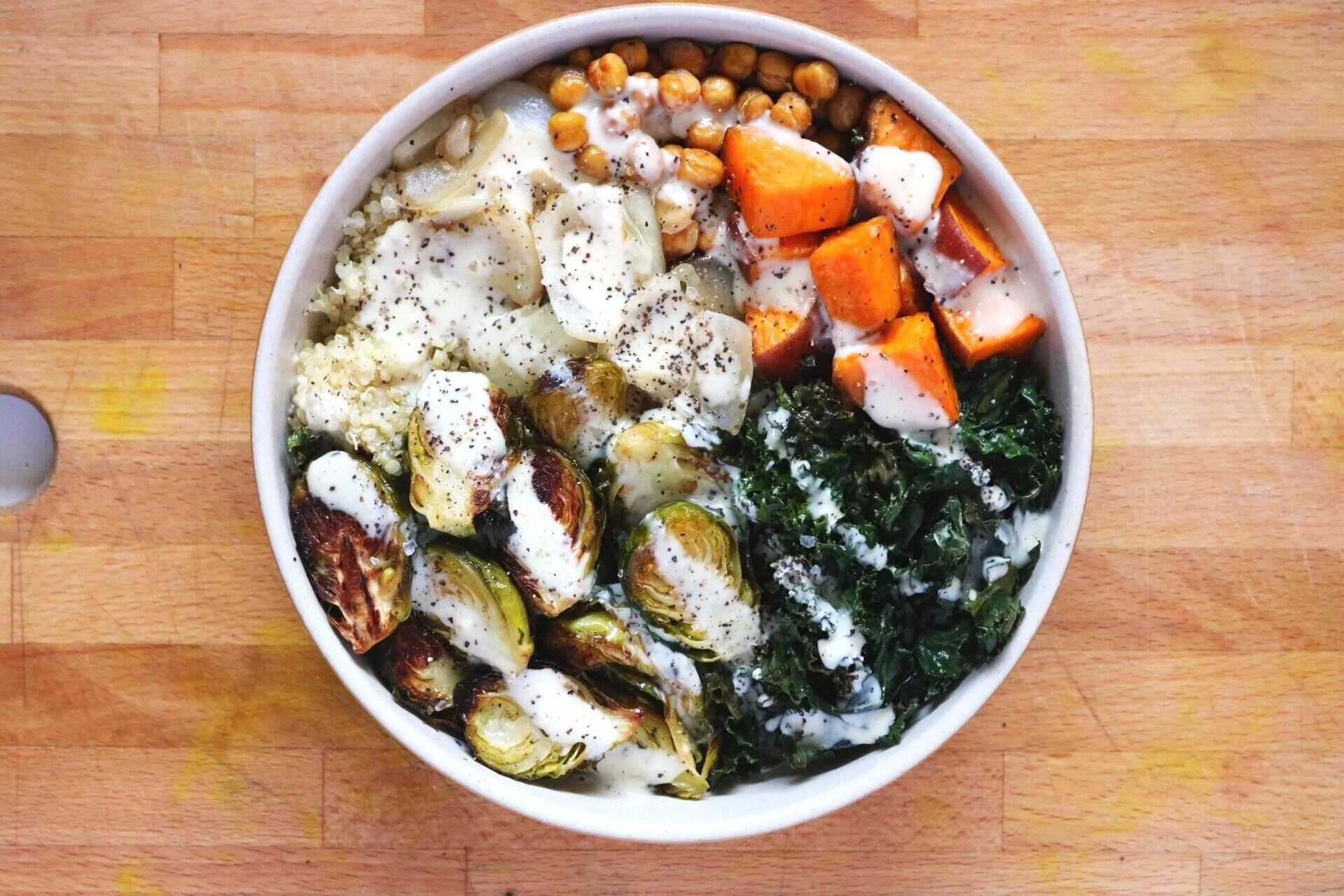 Build your bowl. quinoa on the bottom, then all your veg + tahini drizzle + some salt & pepper!!
