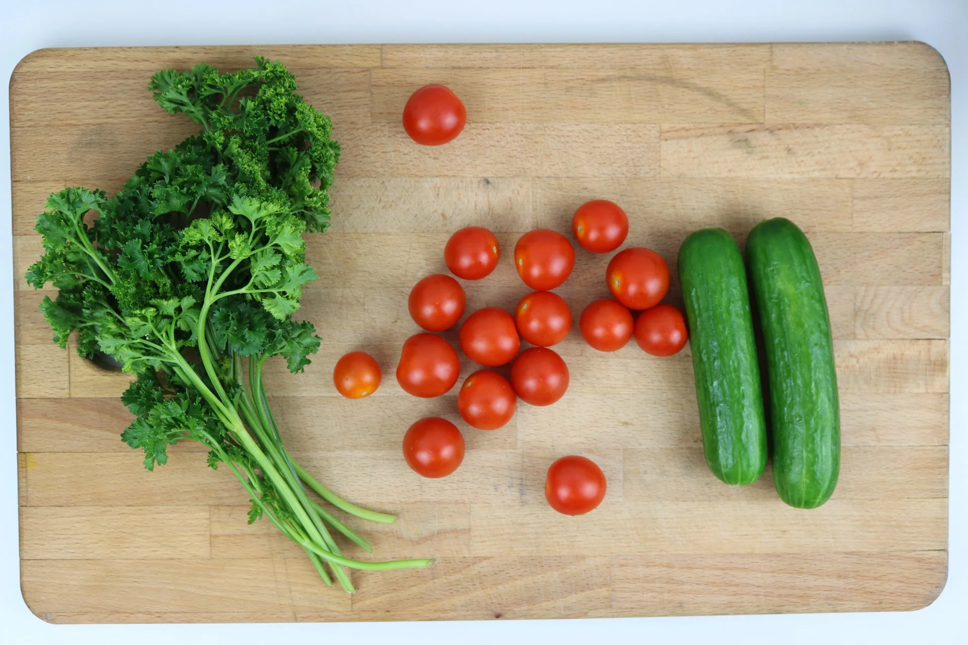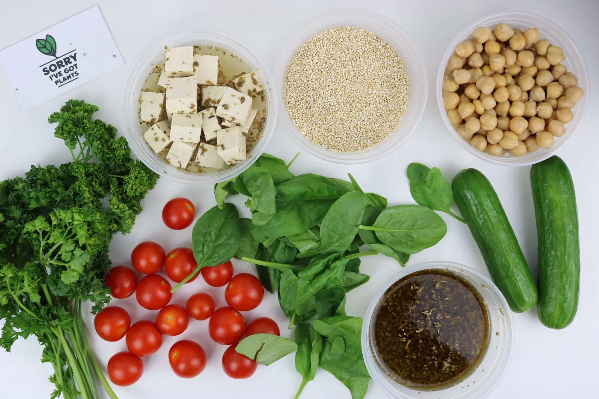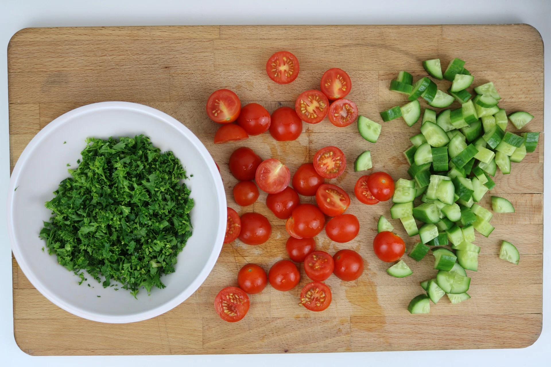 ingredients: rice, cherry tomatoes, spinach, parsley, chickpeas, cucumber, quinoa