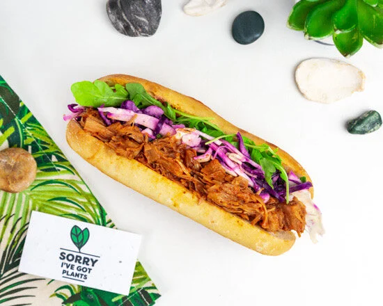 ingredients: hoagie, bbq pulled jackfruit (onion, garlic, young jackfruit, canned pineapple, chilli powder, cumin, liquid smoke, tamari, bbq sauce), coleslaw (purple cabbage, white cabbage, veganaise, apple cider vinegar, salt & pepper), arugula, grainy dijon
