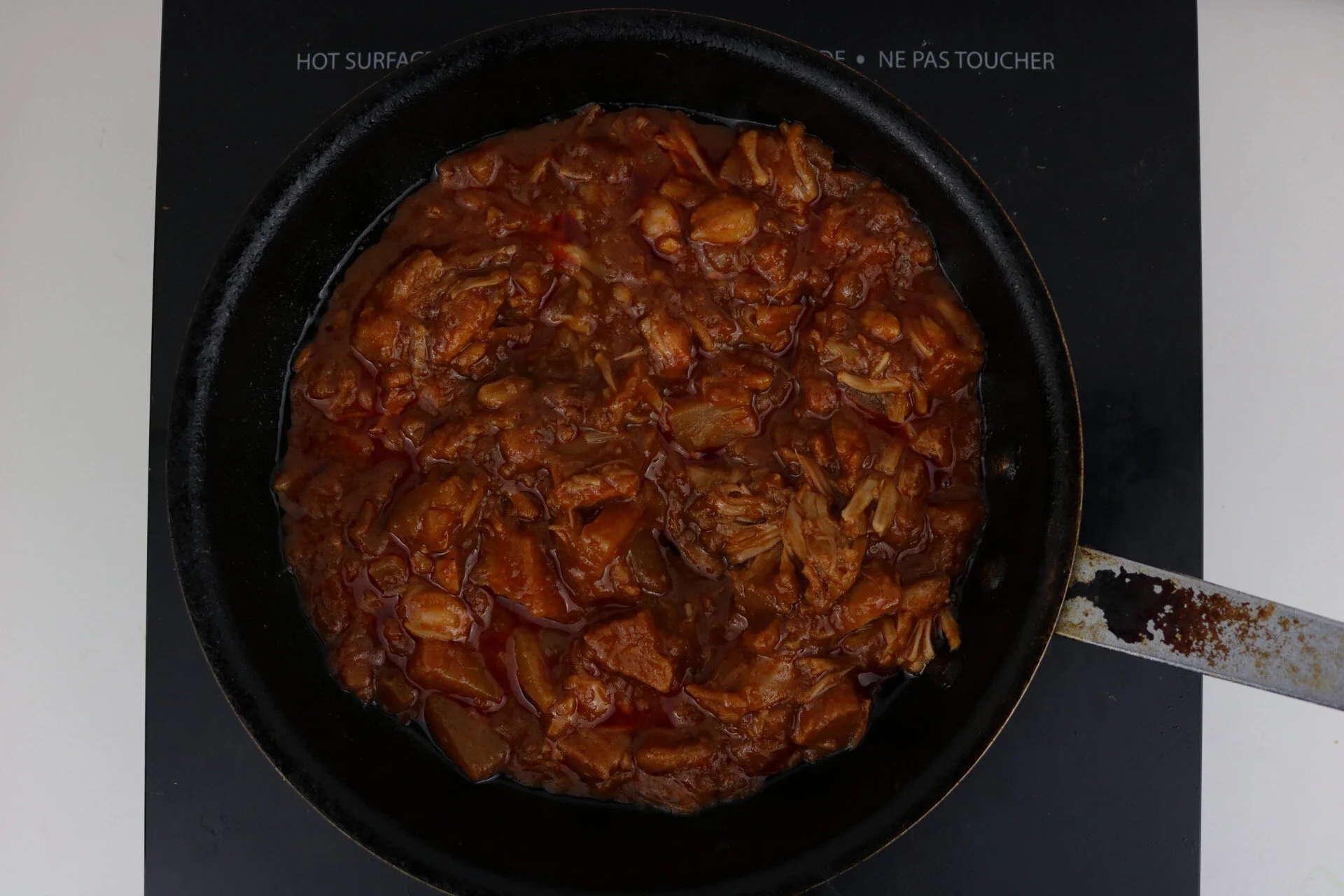 In that same, pan add in a small splash of oil. Once up to temperature, add in your BBQ Jackfruit mix and let cook for ~10 minutes, stirring regularly