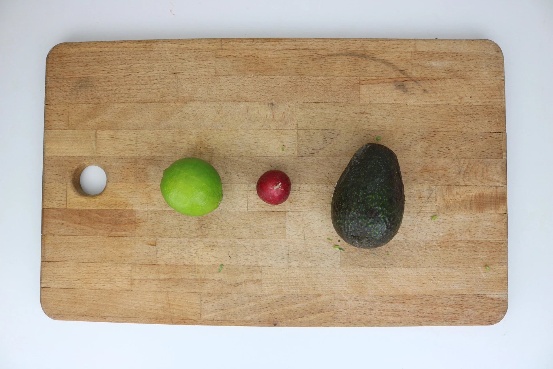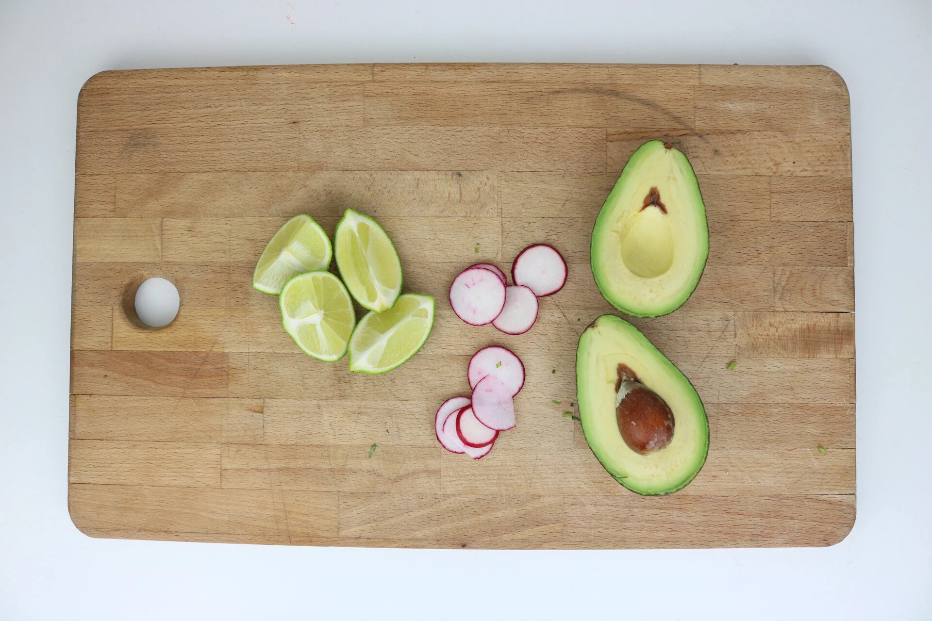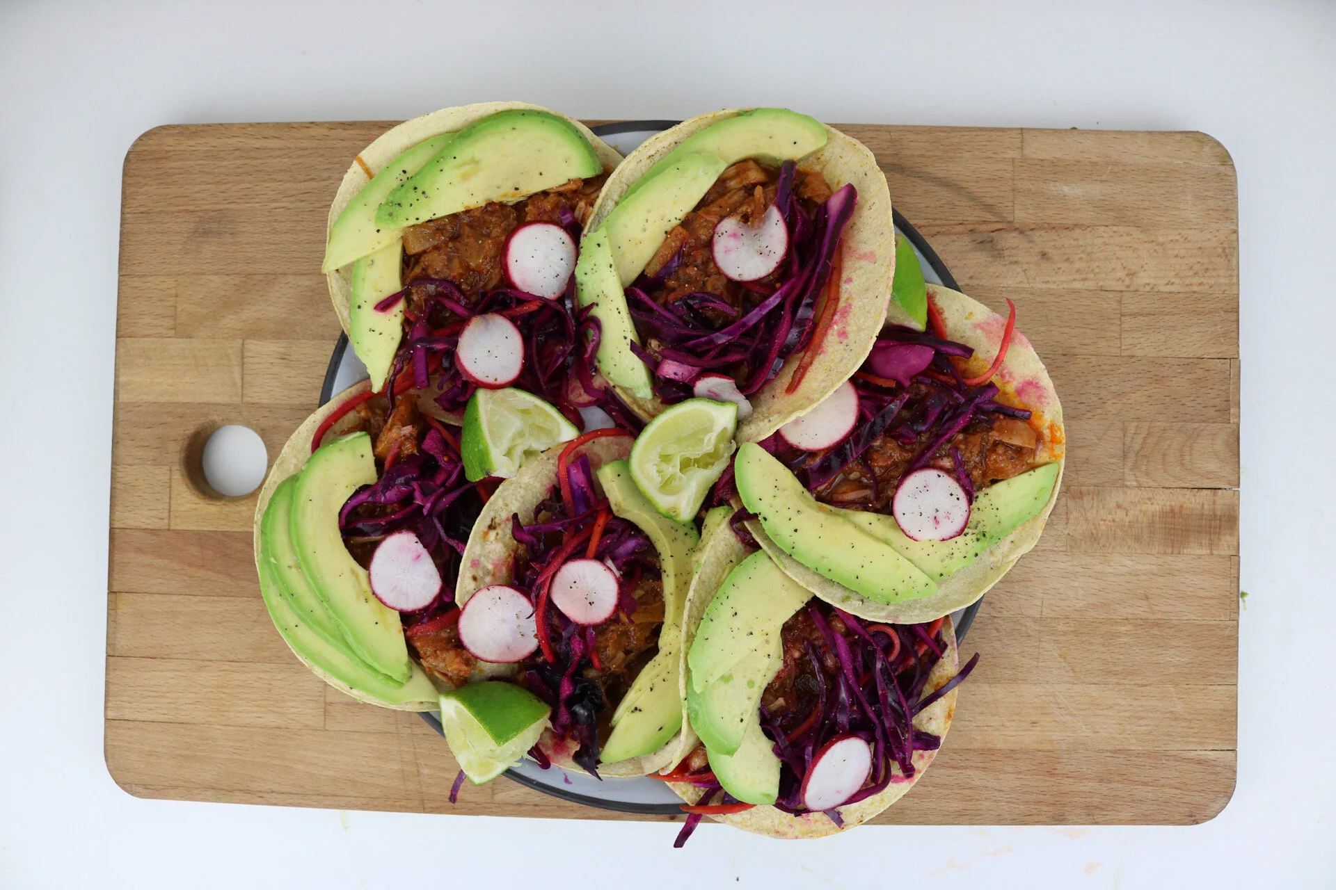 Build your tacos. Shell – BBQ Jackfruit - coleslaw – avocado – radish. Squeeze those limes + a pinch of salt & pepper on your avocado. ENJOY!