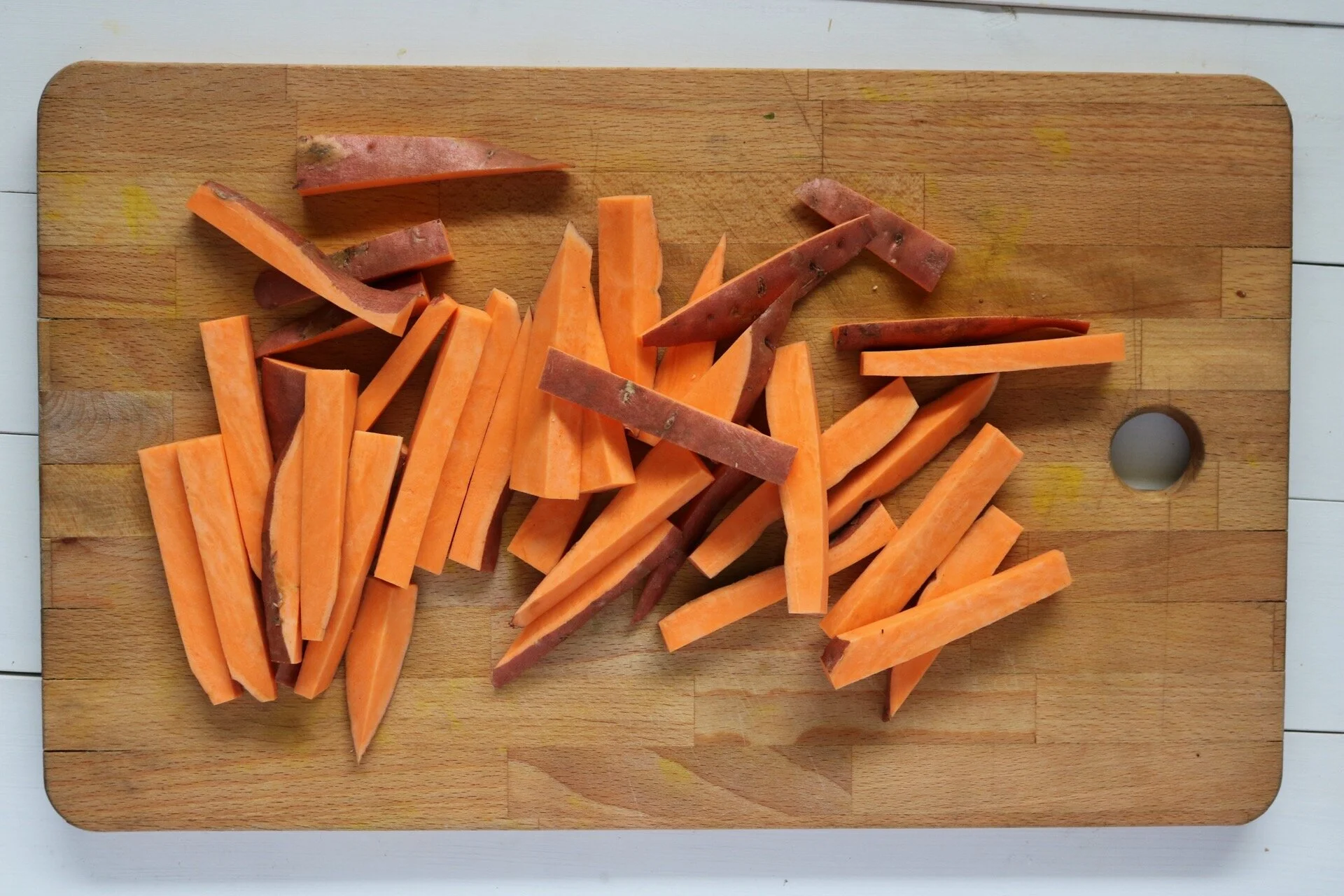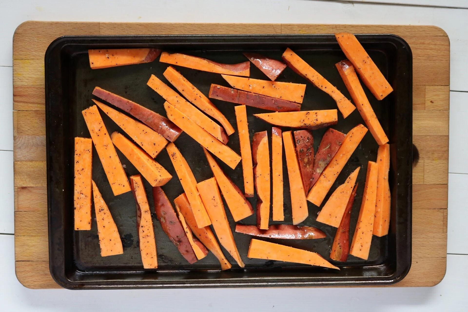Remove your sweet potato and cut as shown below…you can also cut them into cubes if that’s easier! Toss in oil + salt & pepper, then transfer to a baking sheet and place into oven for ~ 18 mins, flipping once half-way through.