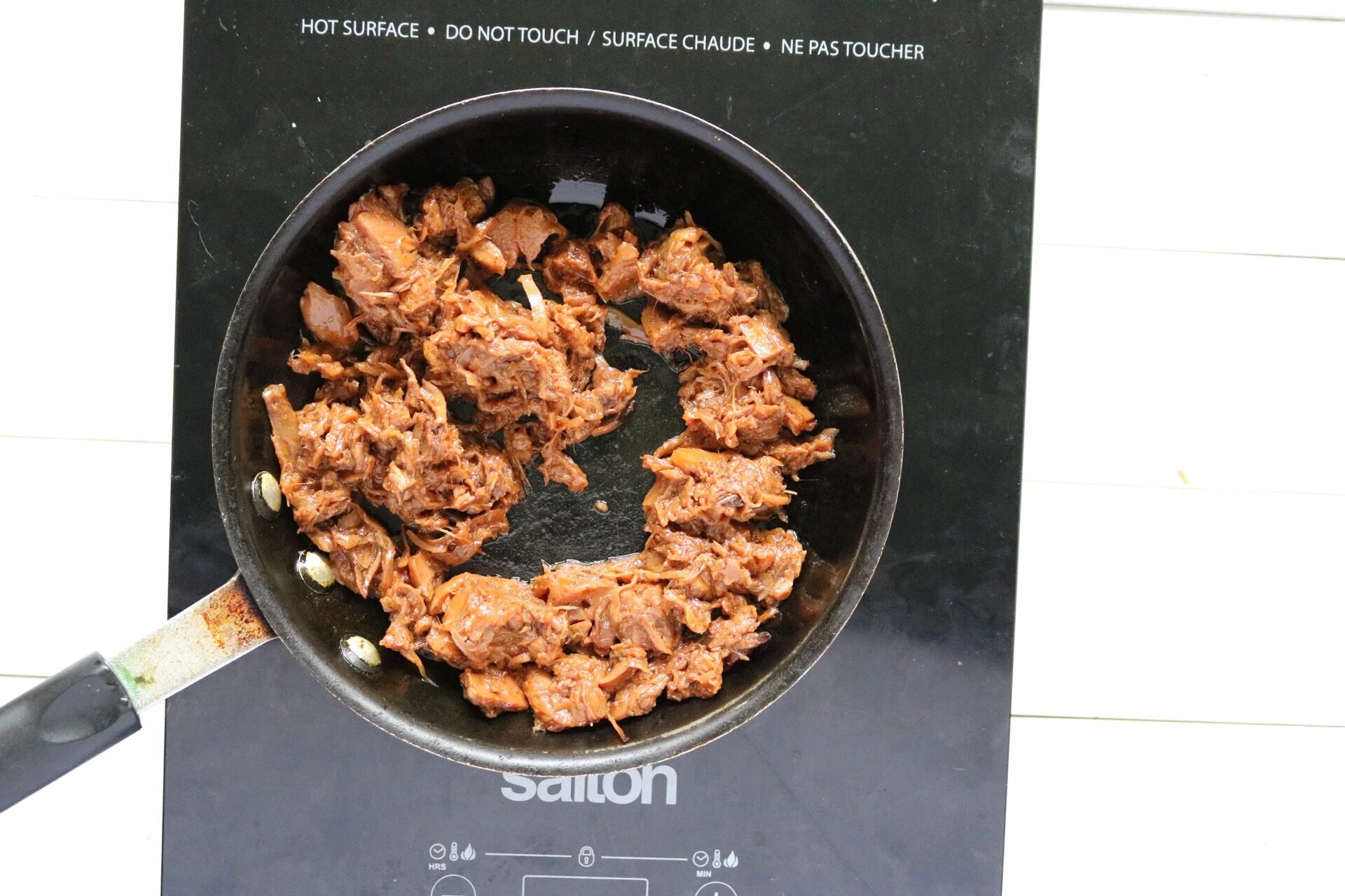 Bring a small pan up to medium heat. Once the pan is hot, add in your Jackfruit and cook until it is at your desired temperature. If there are any big pieces, use a fork to pull apart.