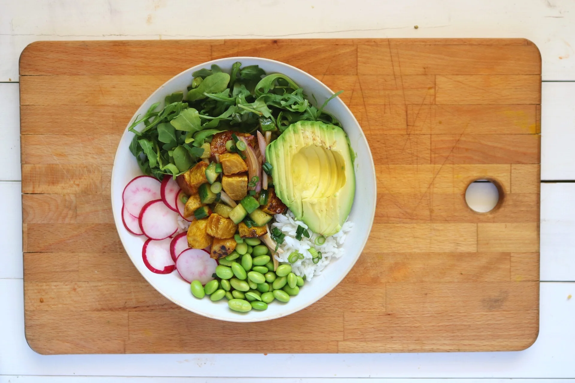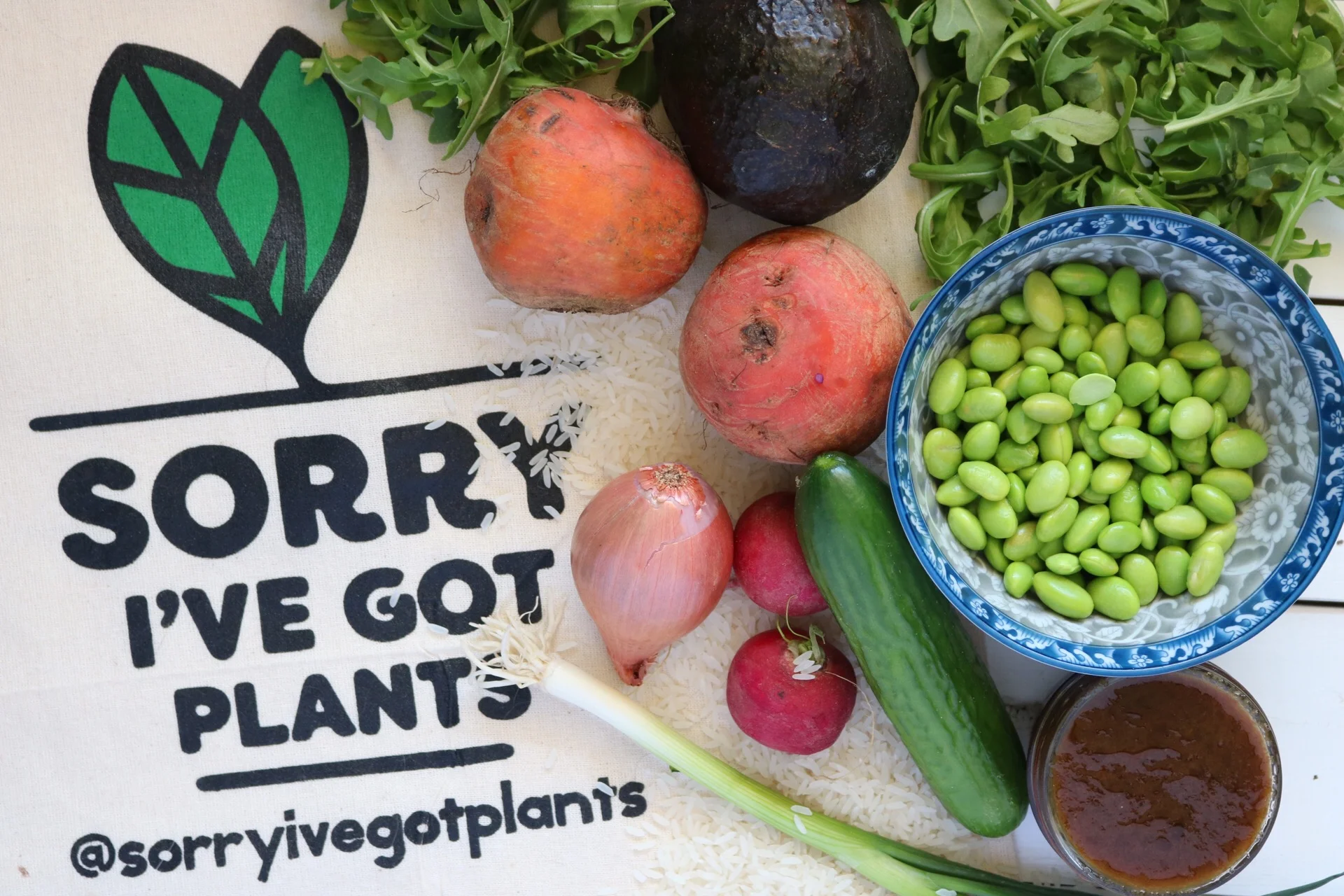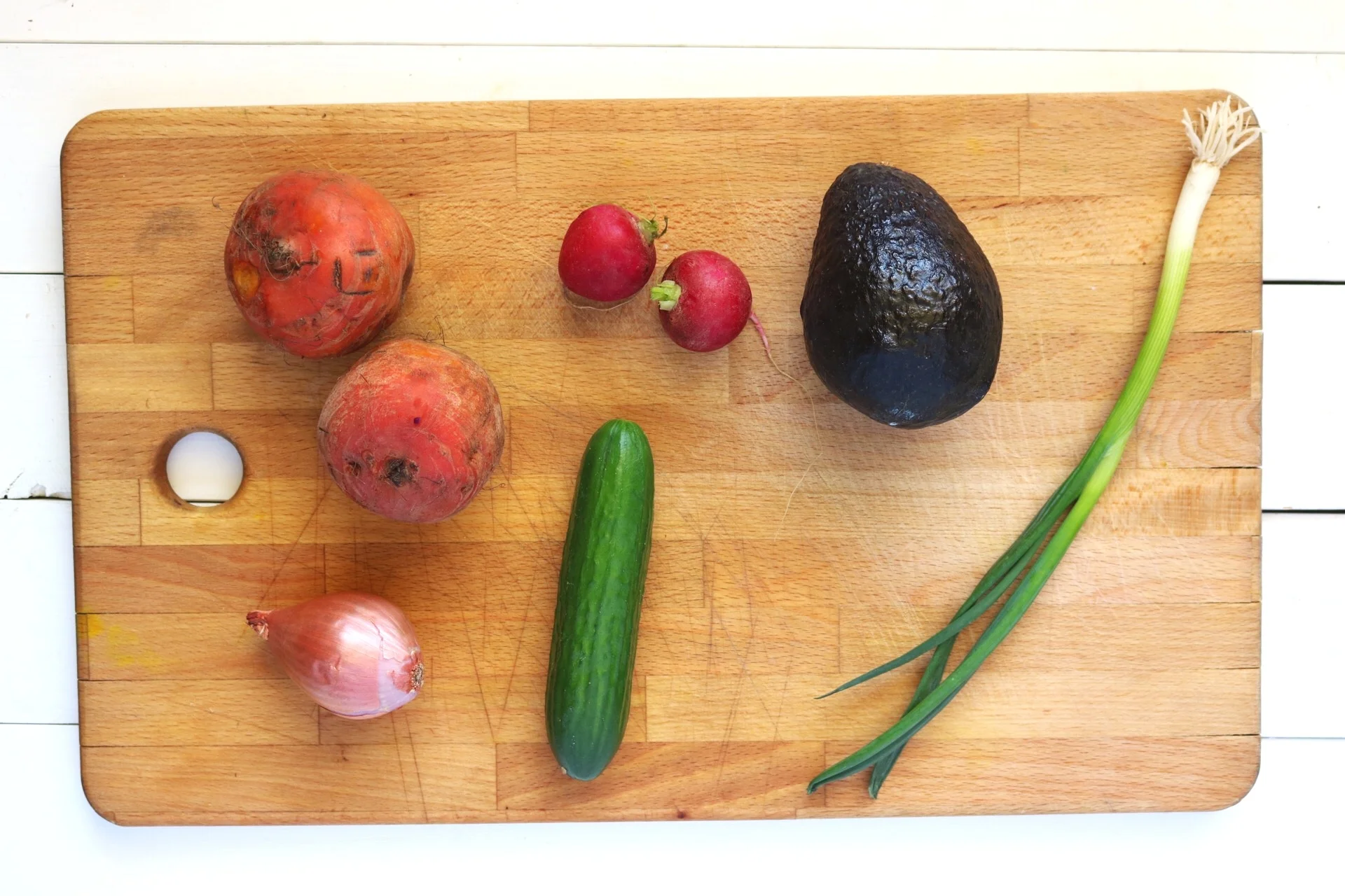 ingredients: golden beets, cucumber, radish, avocado, edamame, rice, shallot, green onion