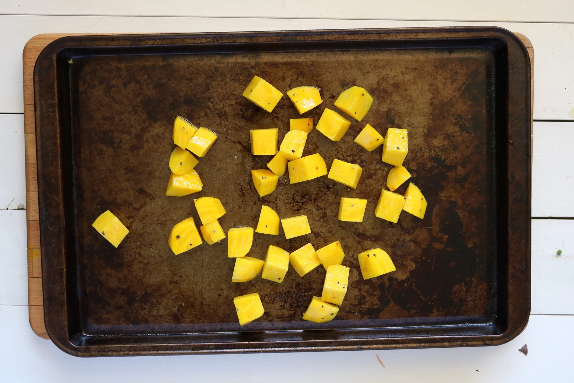 Once your veggies are cut, toss your golden beets into a bowl and coat with oil + salt and pepper. Transfer to a baking sheet. Place in the oven and cook for ~20 minutes.