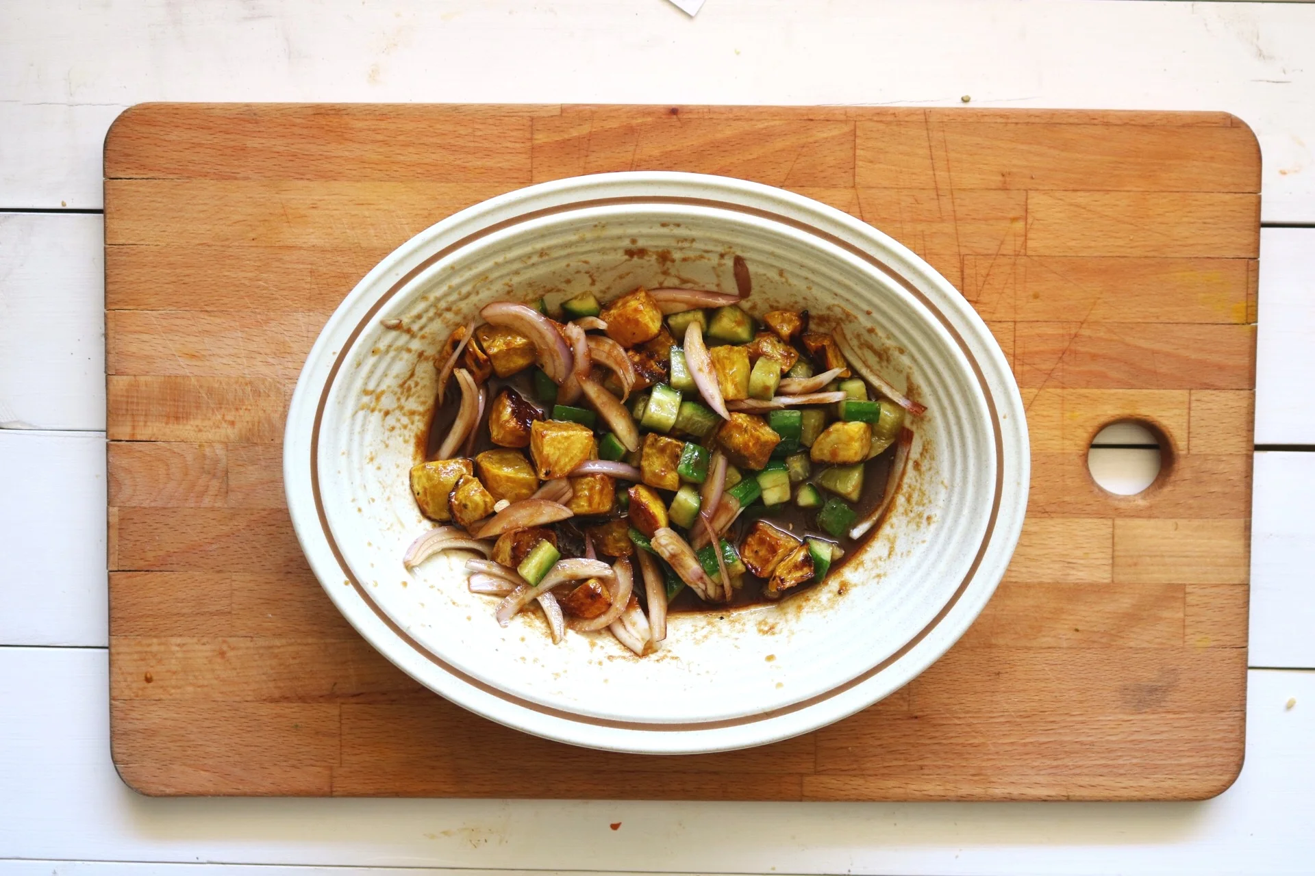 In your bowl, grab a new one if you need it, toss your roasted beets, shallots, cucumber & sauce.