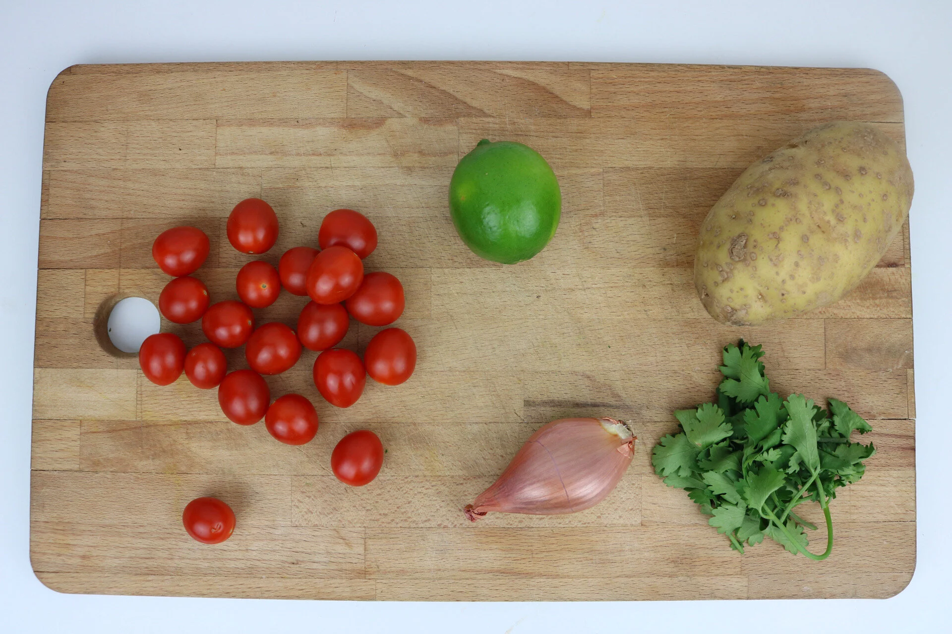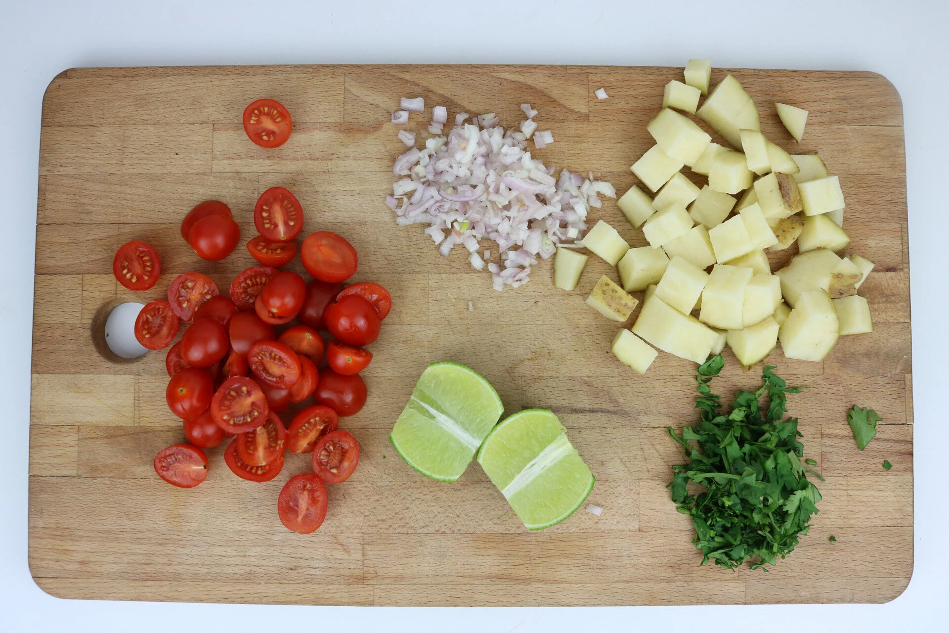 ingredients: tofu, cherry tomato, shallot, parsley, potato, spinach, quinoa