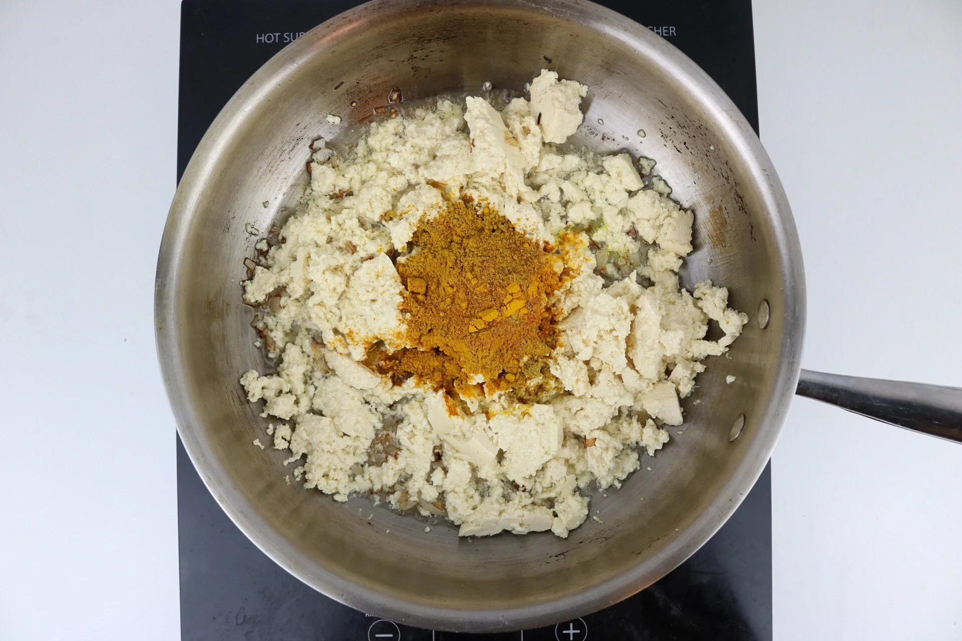 Bring a small sauce pan + a splash of oil up to medium-high heat. First, add in 1/2 of your diced shallot and let cook for ~ 3 minutes. Then, crumble in your tofu (try and break up any larger pieces), stir well for 2 minutes then add in your seasoning with another small splash of oil, stir well, and continue cooking for ~ 4 more minutes.