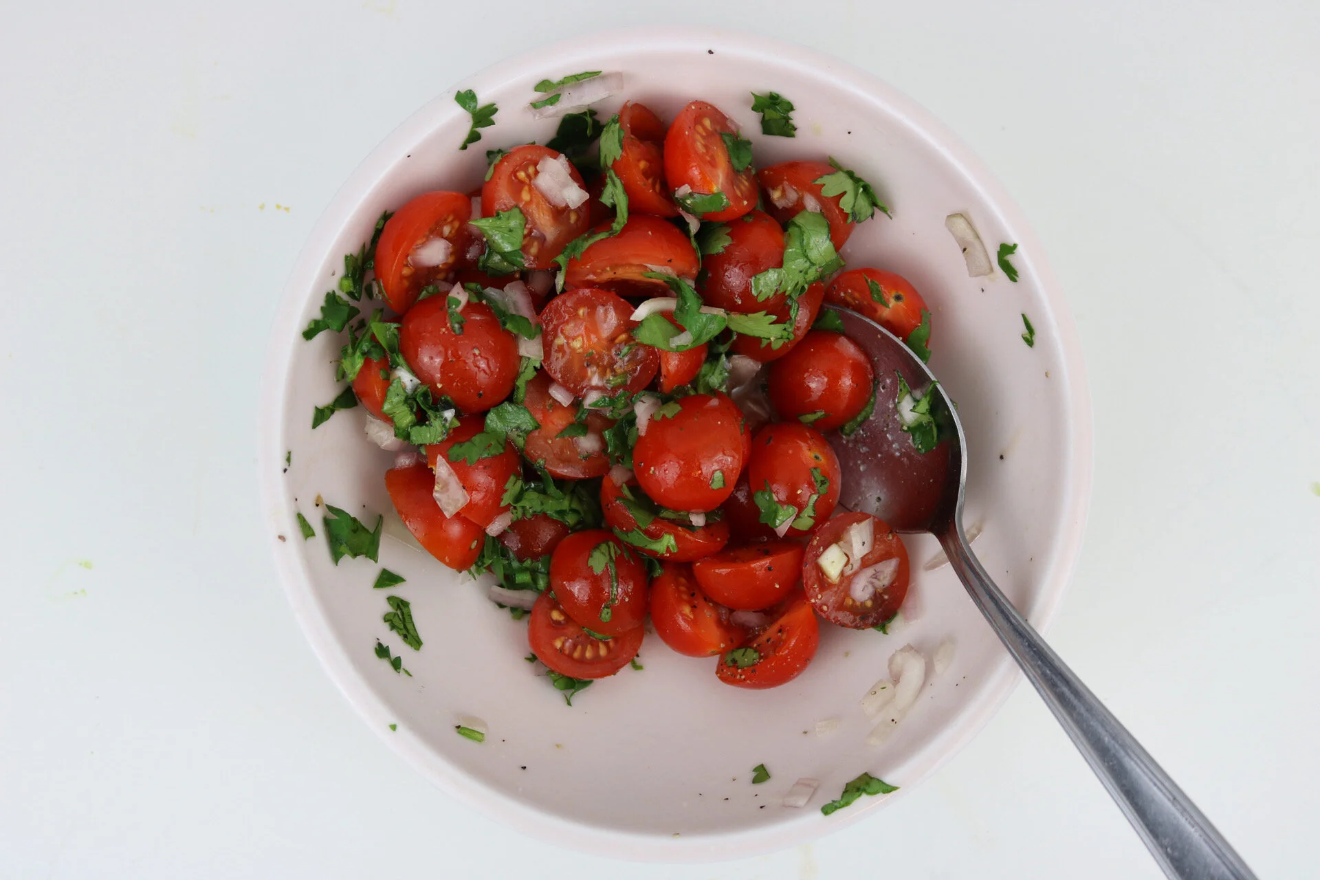 In a separate bowl, combine your tomatoes, cilantro + the other half of your diced shallot. Squeeze in the juice of your lime & season with salt and pepper, mix and set aside.