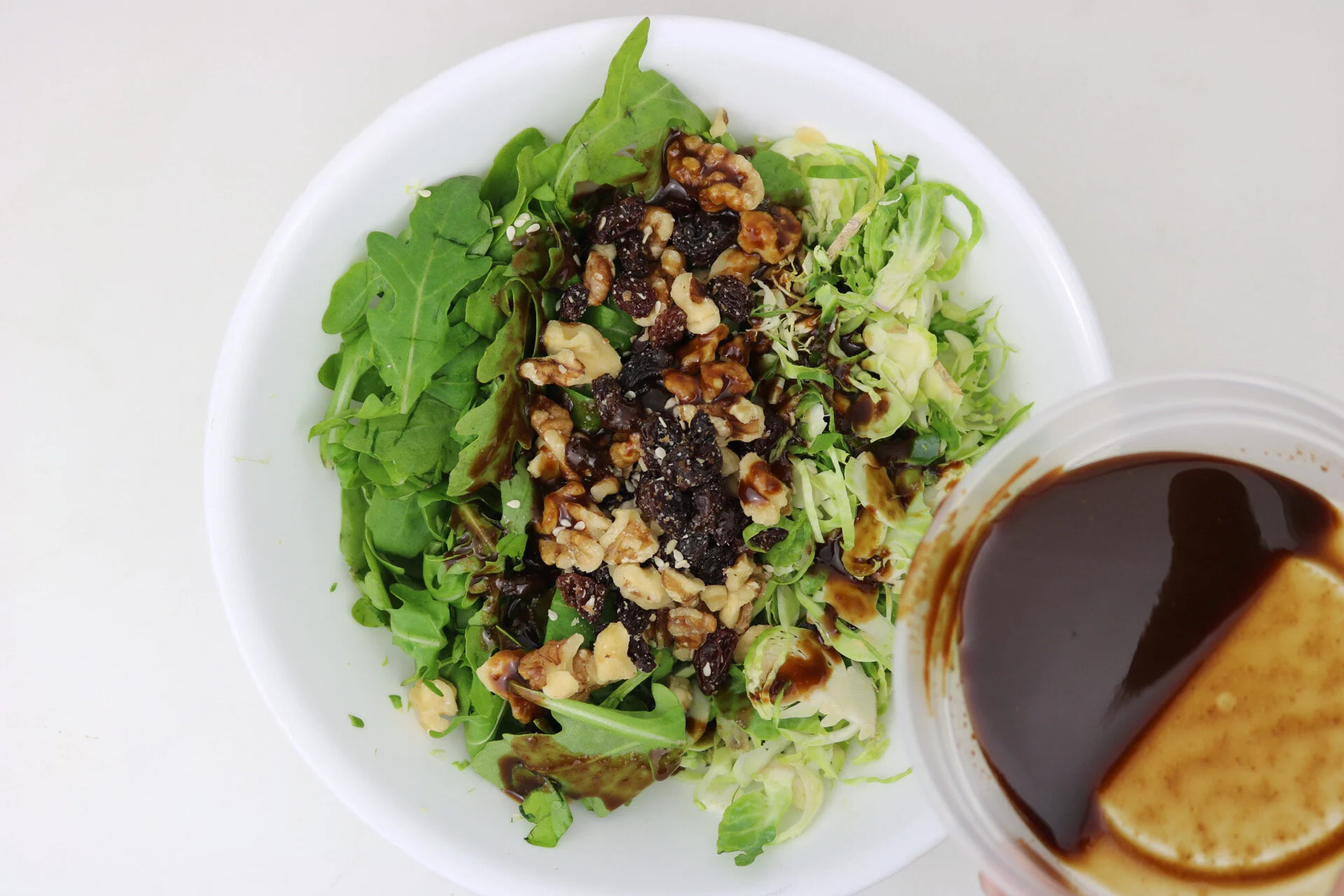 ingredients: brussels sprouts, walnuts, raisins, sesame seeds, arugula, tofu feta