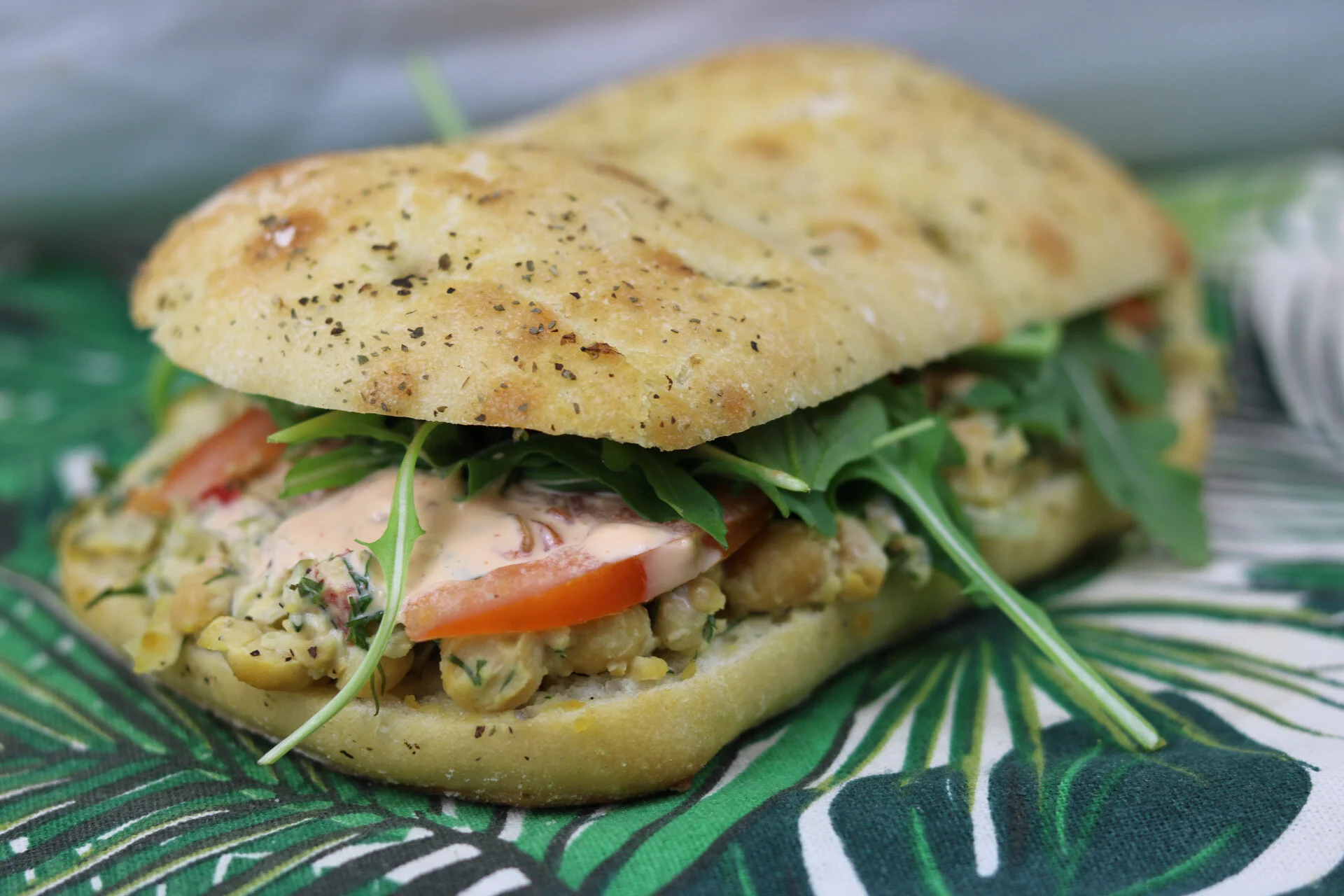 ingredients: mini herb bun, chickpea mix (chickpea, veganaise, mustard, red pepper, red onion, celery, pickles, dill, salt & pepper), tomato, arugula, spicy mayo