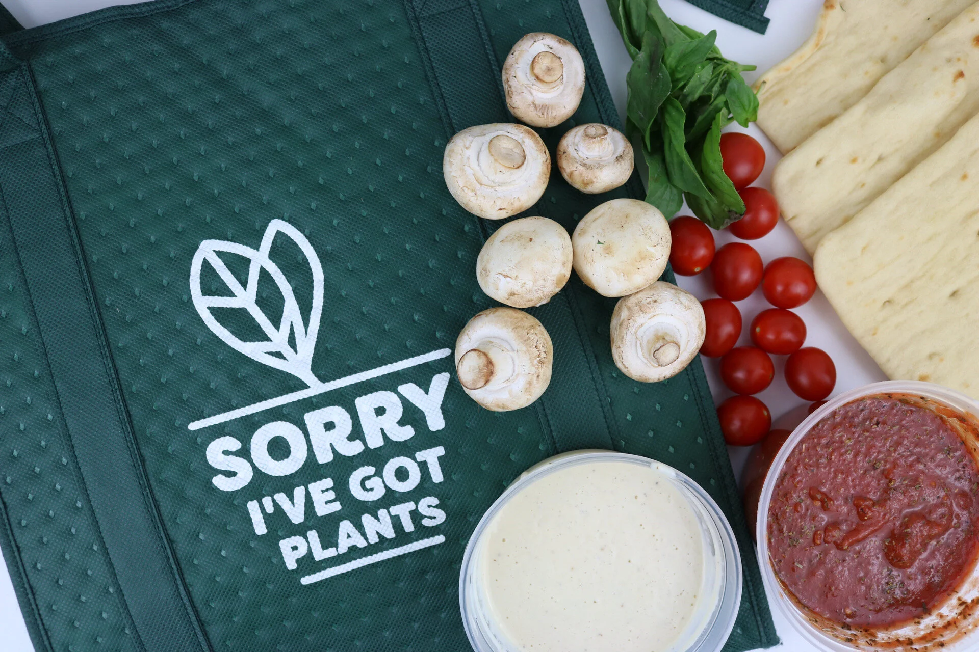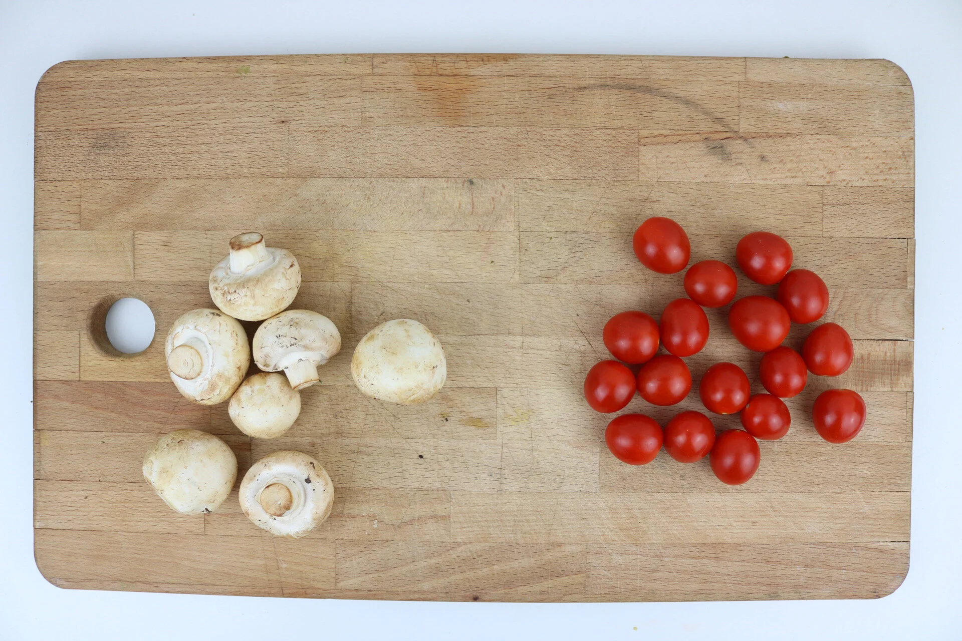 Remove your veggies from the bag and dice the tomatoes, mushrooms, and basil.