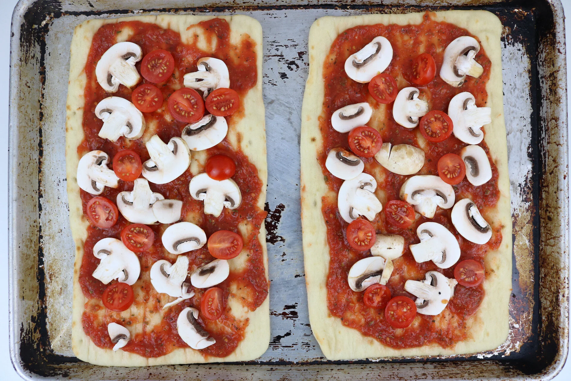 Build your flatbread. Sauce on the bottom, then tomato and mushroom on top! Once your oven is hot, bake for ~11 mins. You can always cook them longer or shorter depending on how you like your crust!