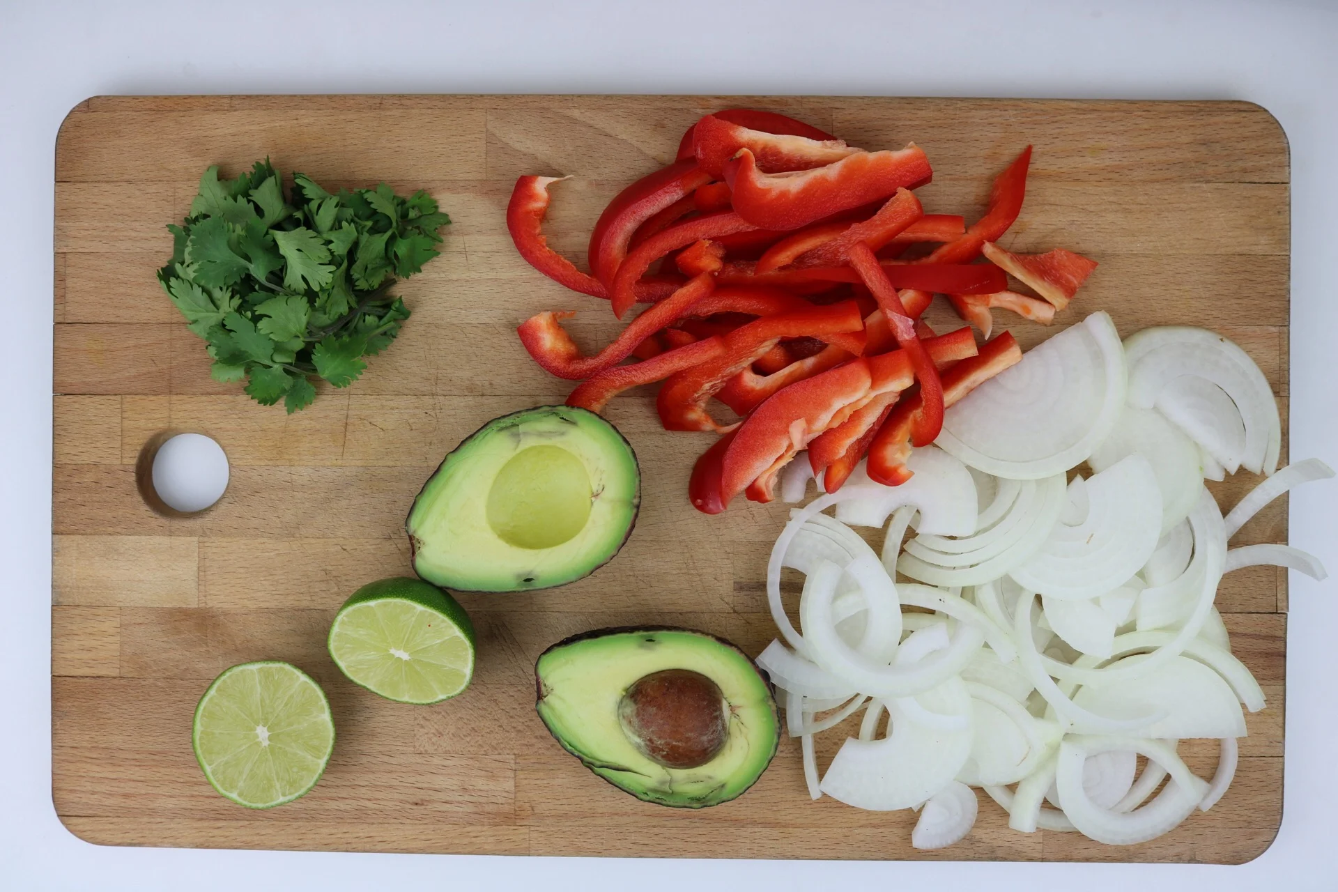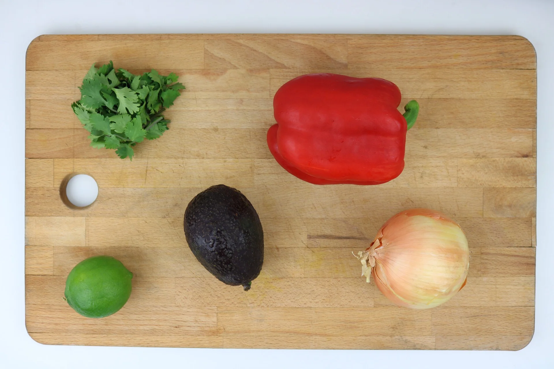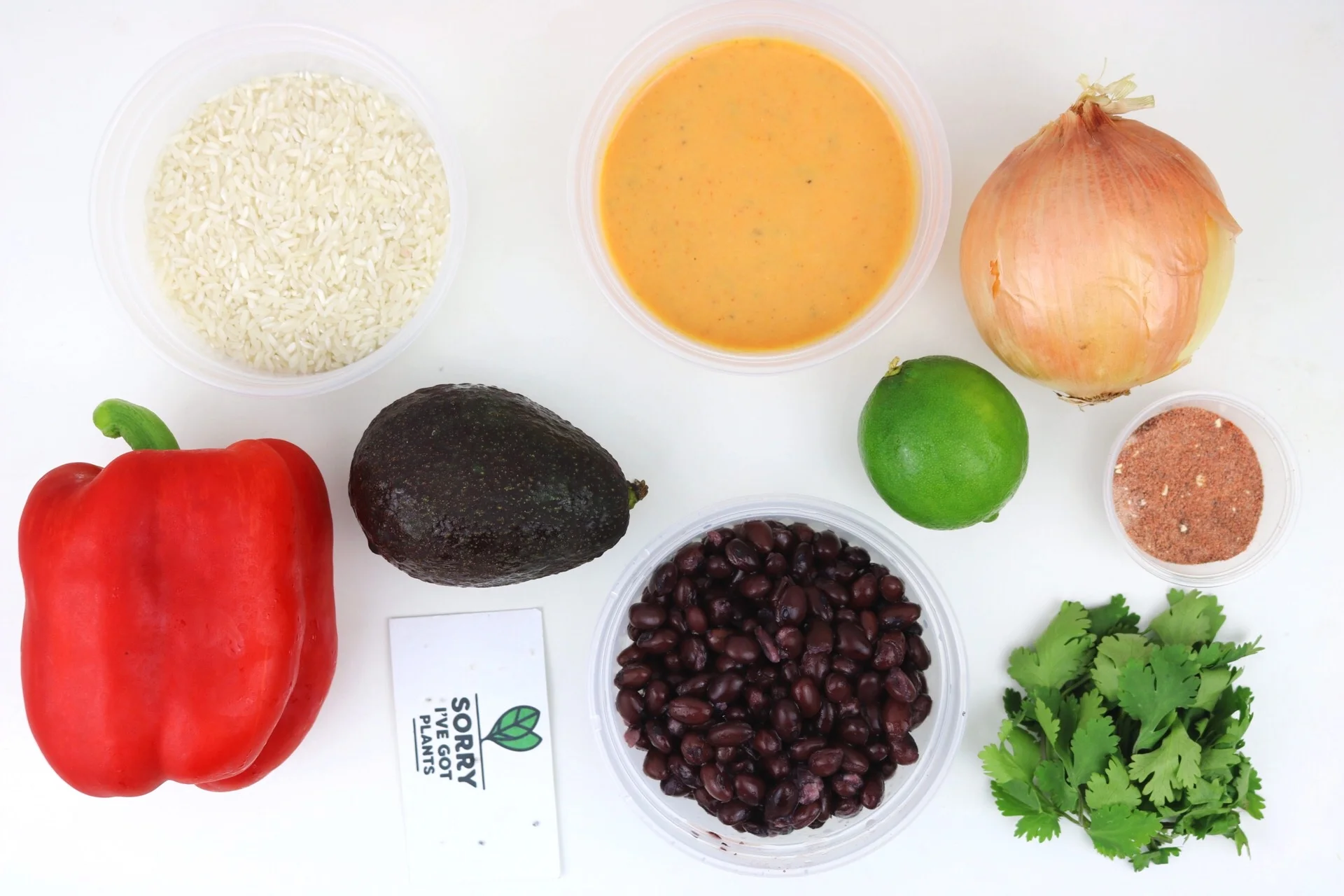 ingredients: onion, red pepper, black beans, avocado, lime, rice, cilantro