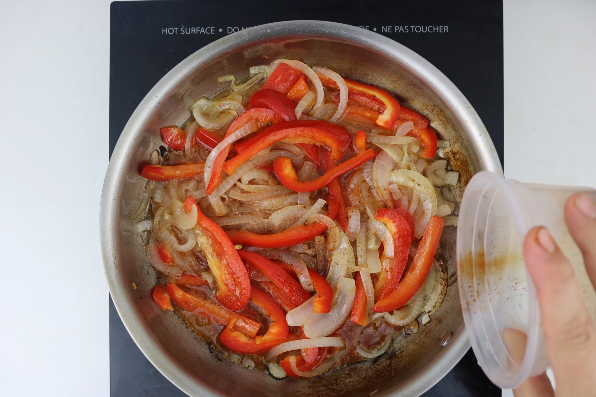 Bring a sauce pan + 1 tbsp of oil up to medium high heat. Once hot add in your diced onion and your red pepper. Let cook for ~ 7 minutes. Add in your seasoning mix + 1/3 cup of water, keep cooking until all the liquid has evaporated, approx another 7 minutes.