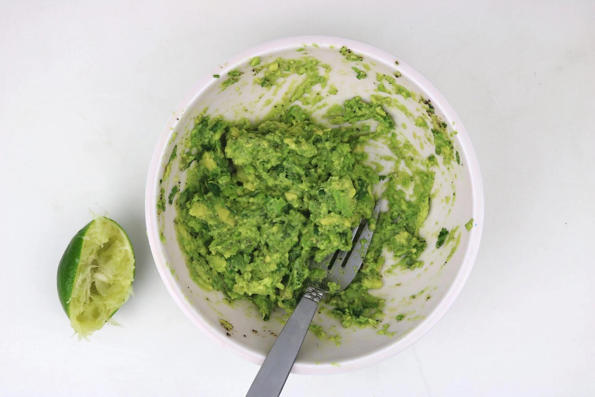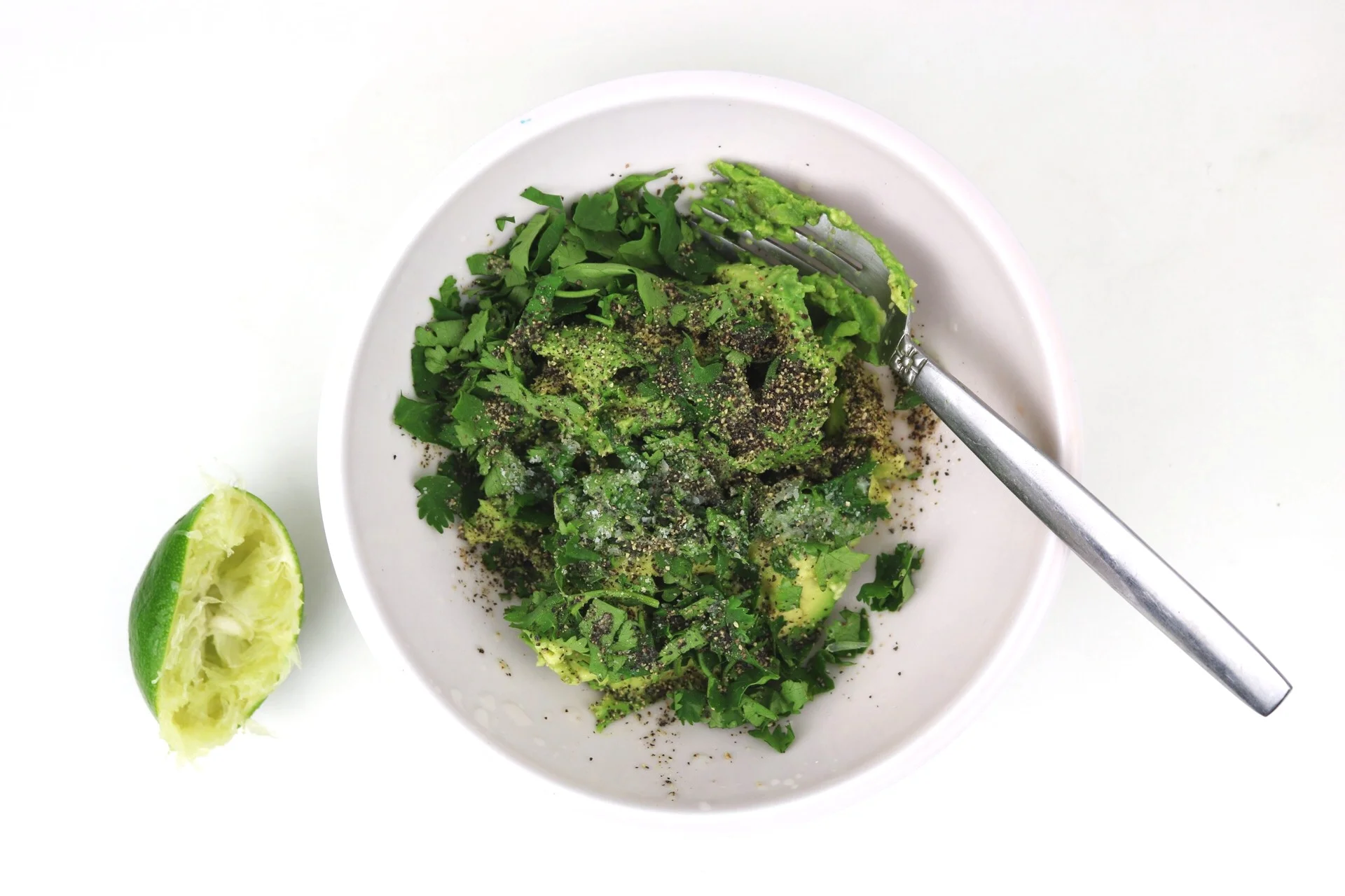in a bowl combine your avocado, cilantro, the juice from your lime +a pinch of salt and pepper. Mix until everything is fully combined.