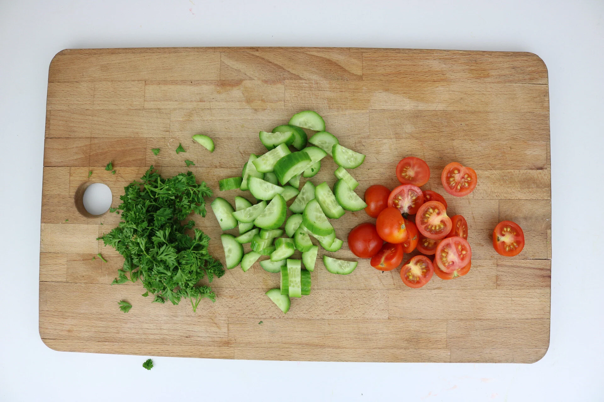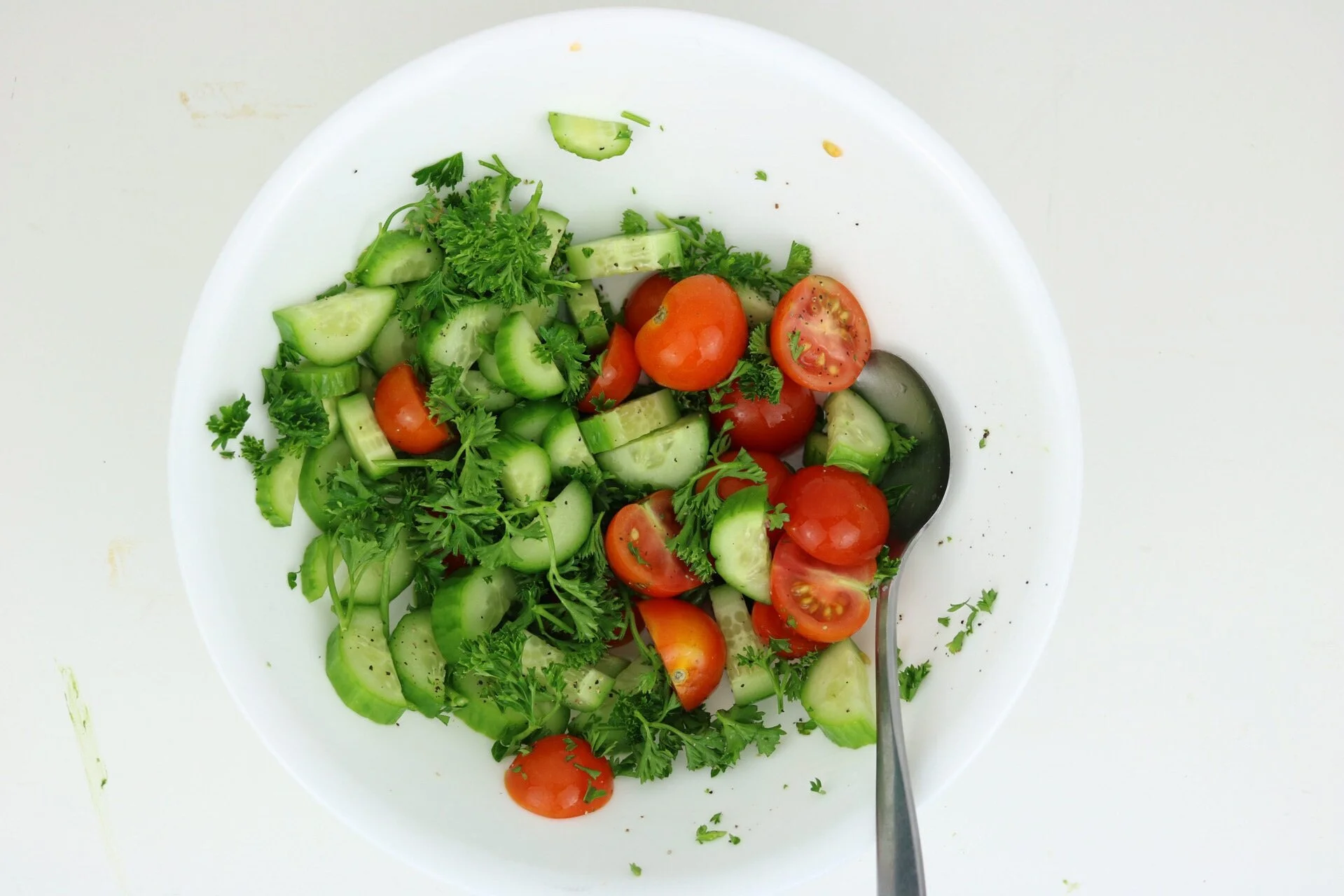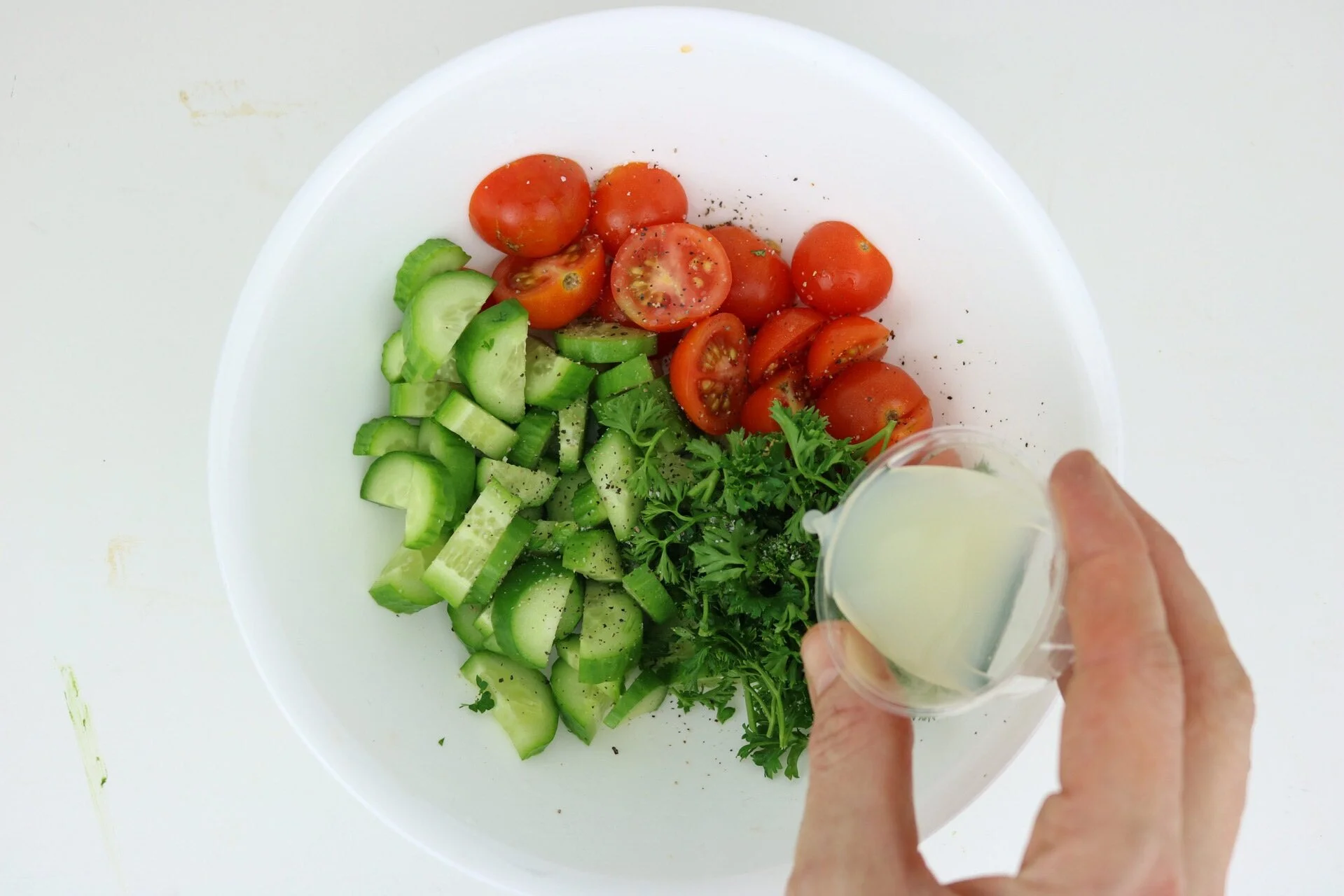 In a small bowl, combine your tomatoes + cucumbers + parsley + lemon dressing and a pinch of salt and pepper. Mix thoroughly.