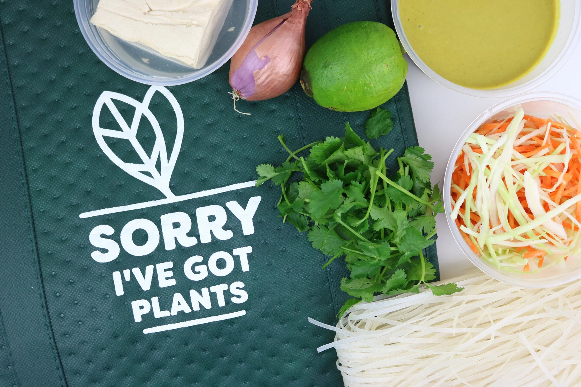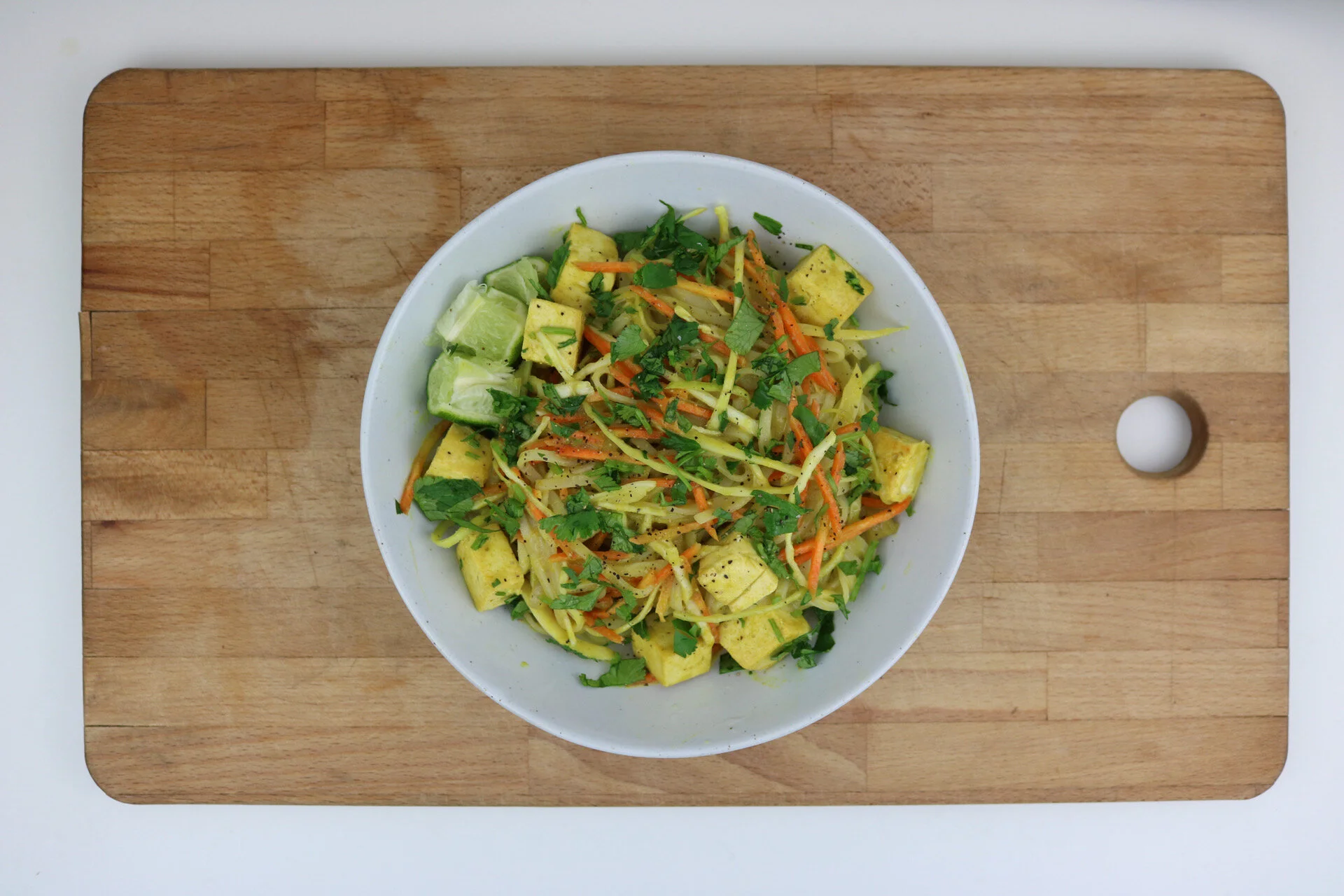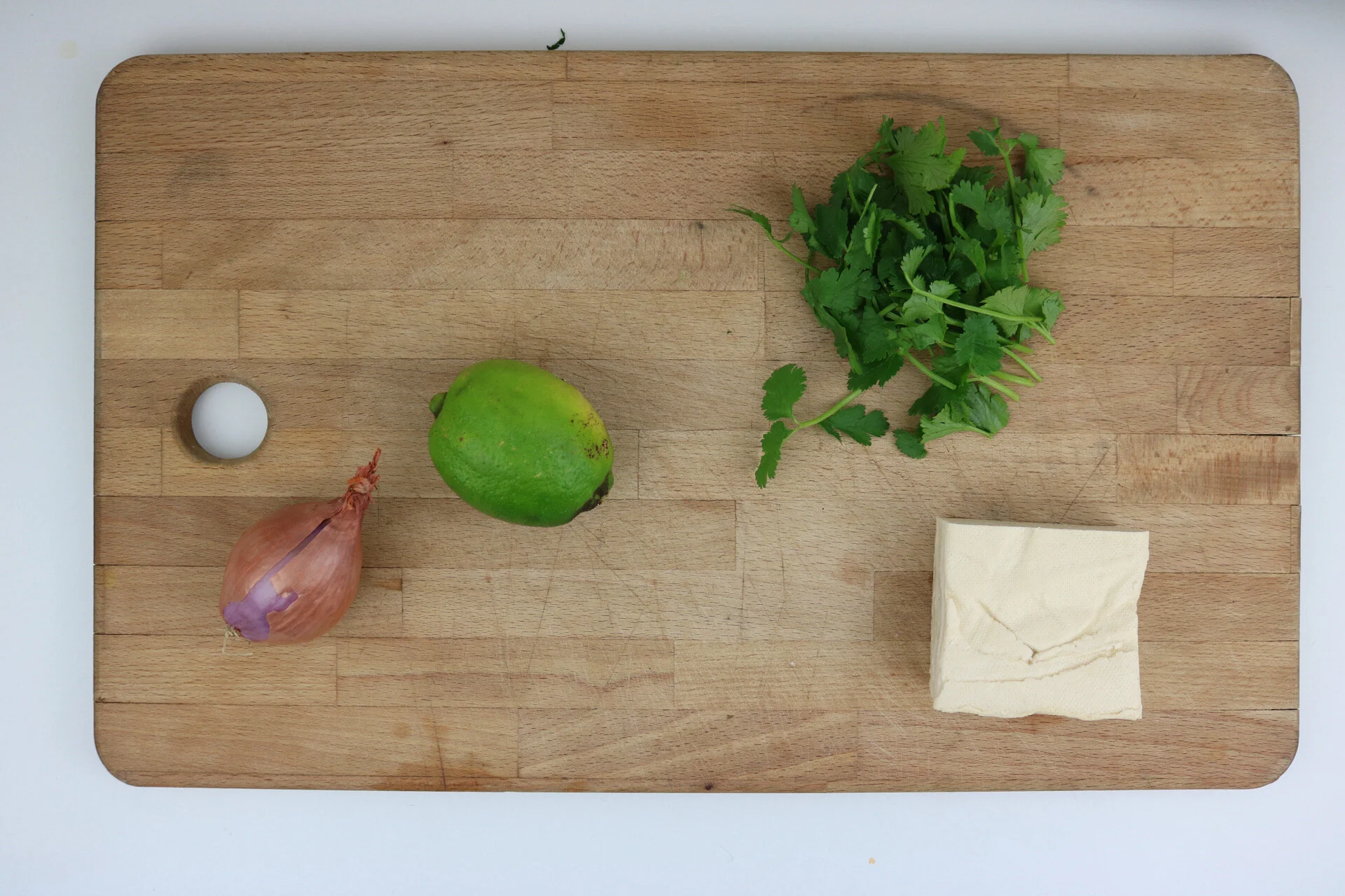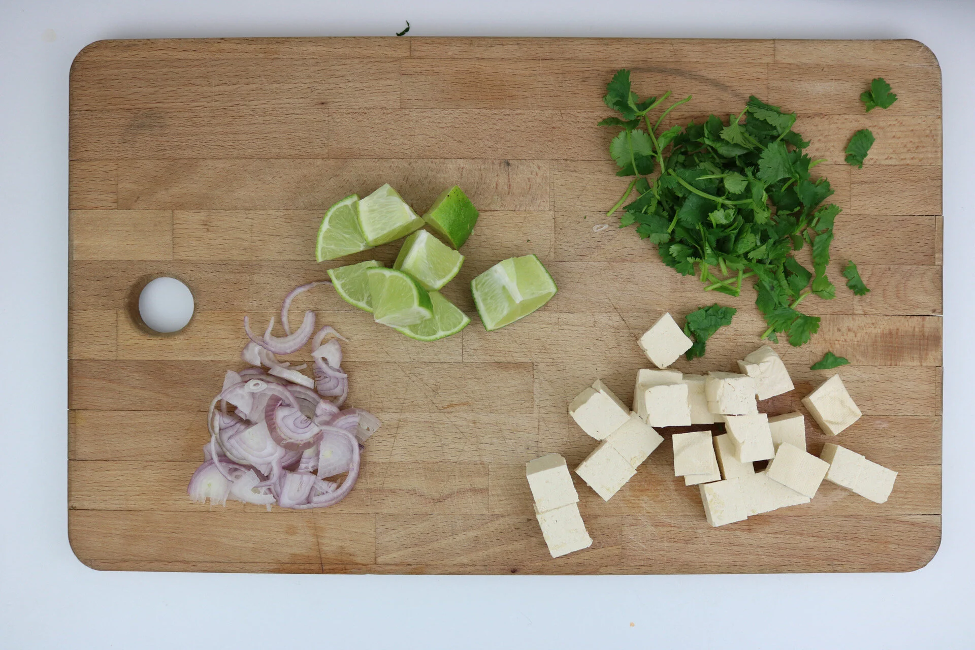 ingredients: rice noodles, shallot, lime, cilantro, tofu, cabbage, carrot