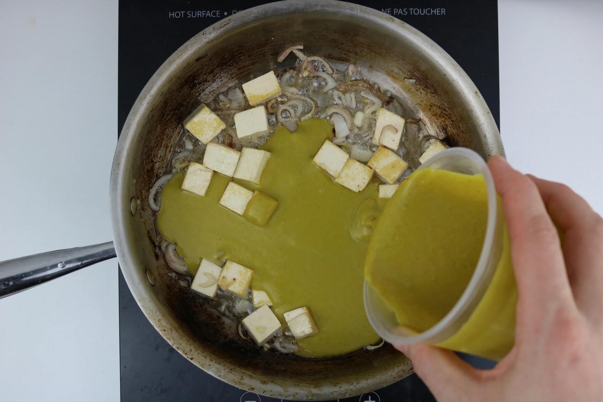 sauce: poblano, onion, garlic, ginger, cumin, turmeric, curry powder, cilantro, tamari, brown sugar, coconut milk, miso, vegetable stock