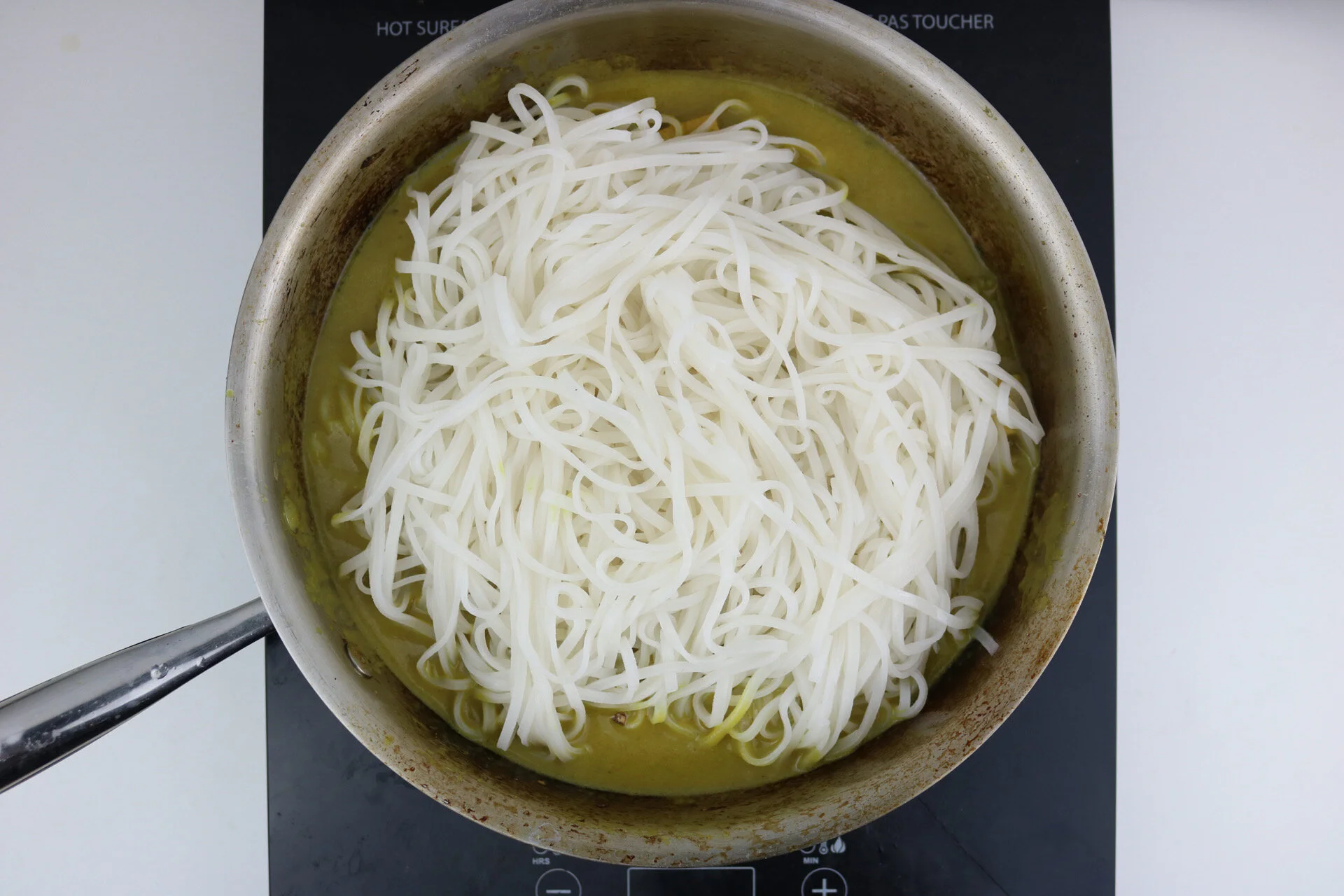 Bring a large pot/kettle of water up to a boil. Once boiling, cover your rice noodles with the water and let them cook for 7-9 minutes, or until there is no crunch when trying. Once done, carefully strain and run the noodles under cold water until they are cold to the touch to stop the cooking process. Set aside.