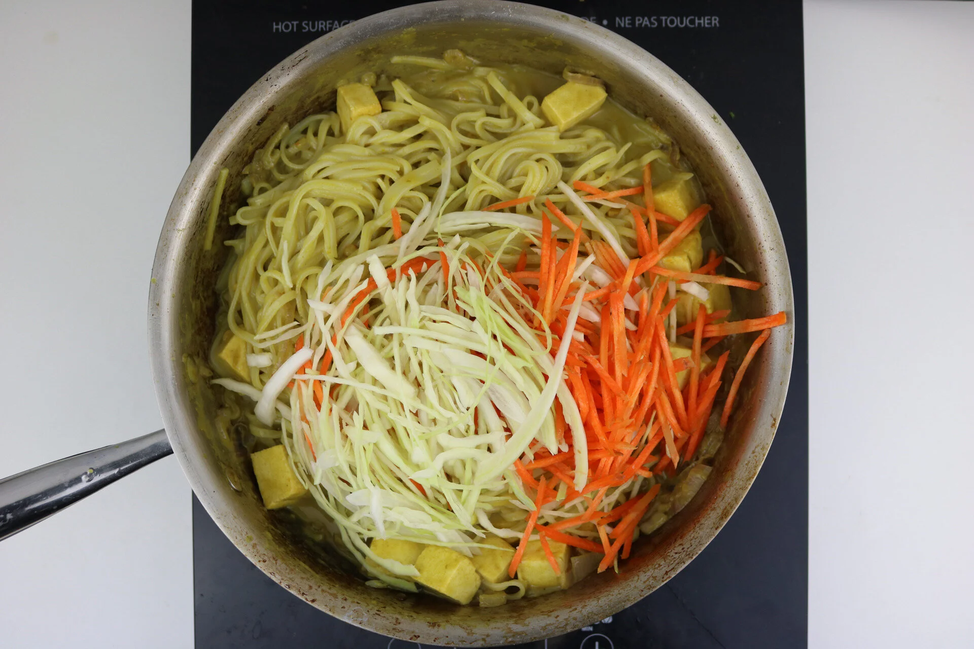 In a large sauce pan, bring 2 tbsp of oil up to medium-high heat. Once hot, add in your shallots and your tofu, and let cook for 5-7 minutes. Next, add in your noodles and your sauce, mixing regularly for the next 5 minutes until the noodles are hot and the sauce has begun to thicken up. Before finishing, add in your carrot + cabbage and cook quickly, still stirring regularly for 2 minutes.