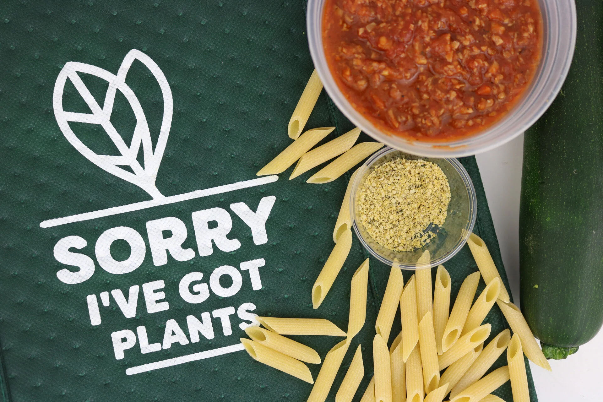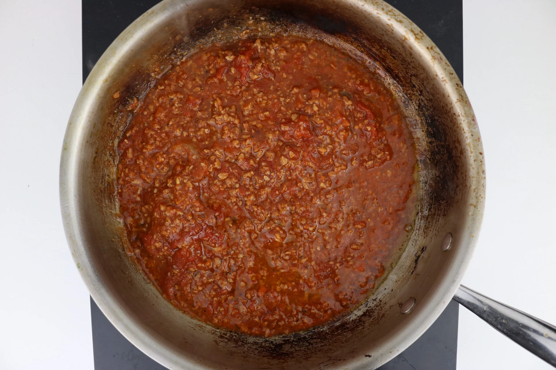 sauce: san marzano tomatoes, garlic, onion, carrot, celery, tvp, basil, veg stock, red wine vinegar, salt + pepper