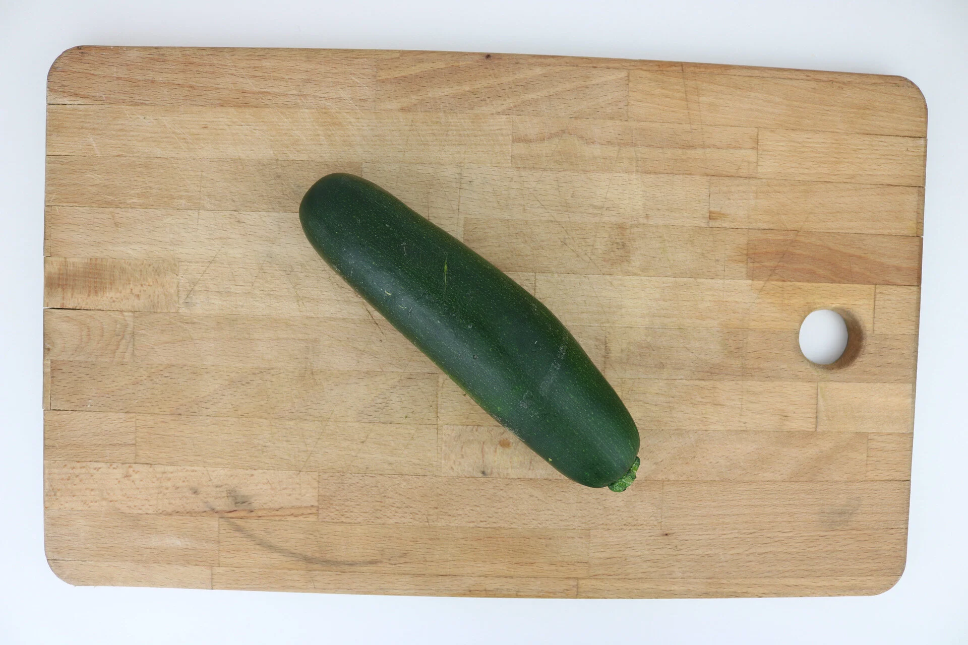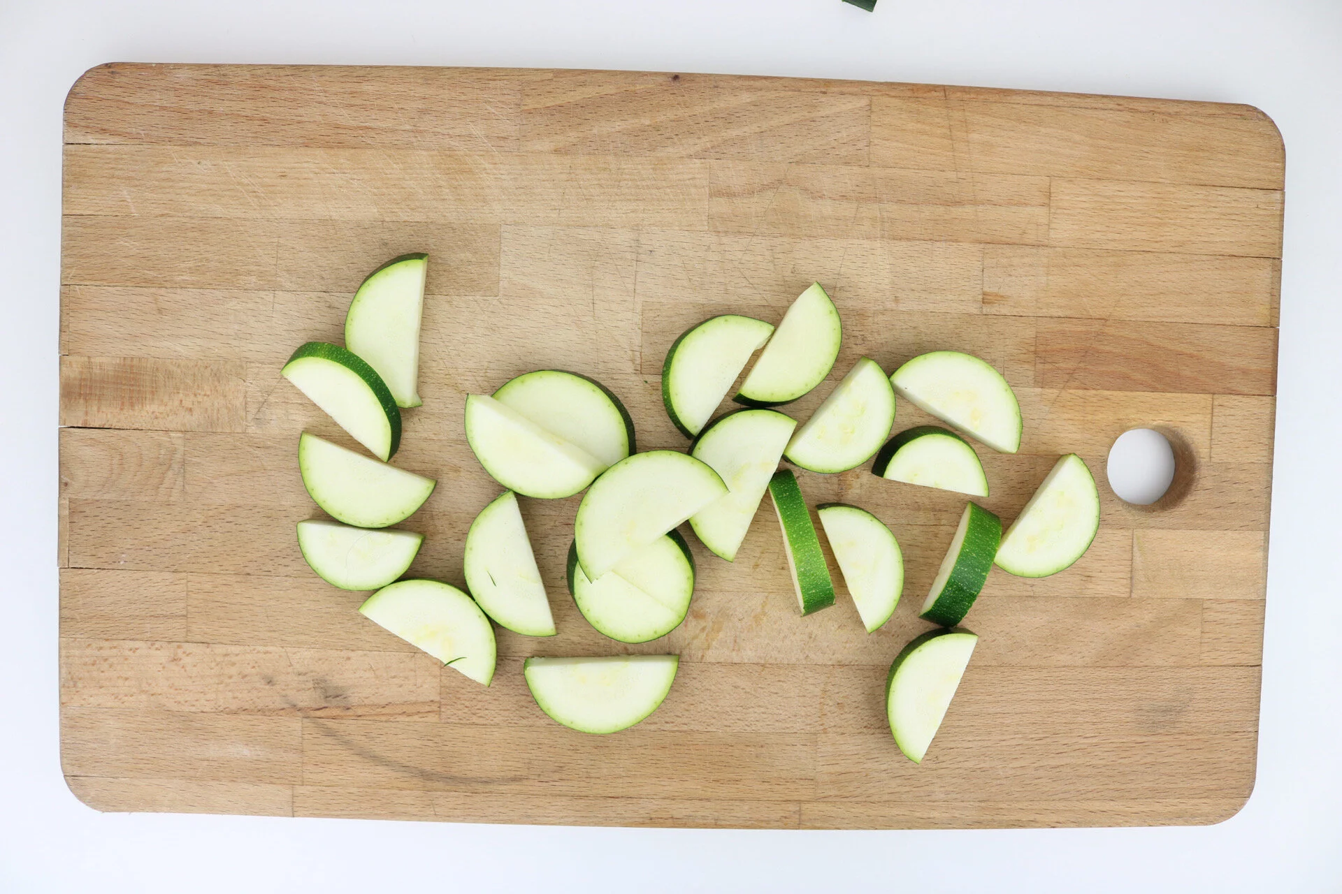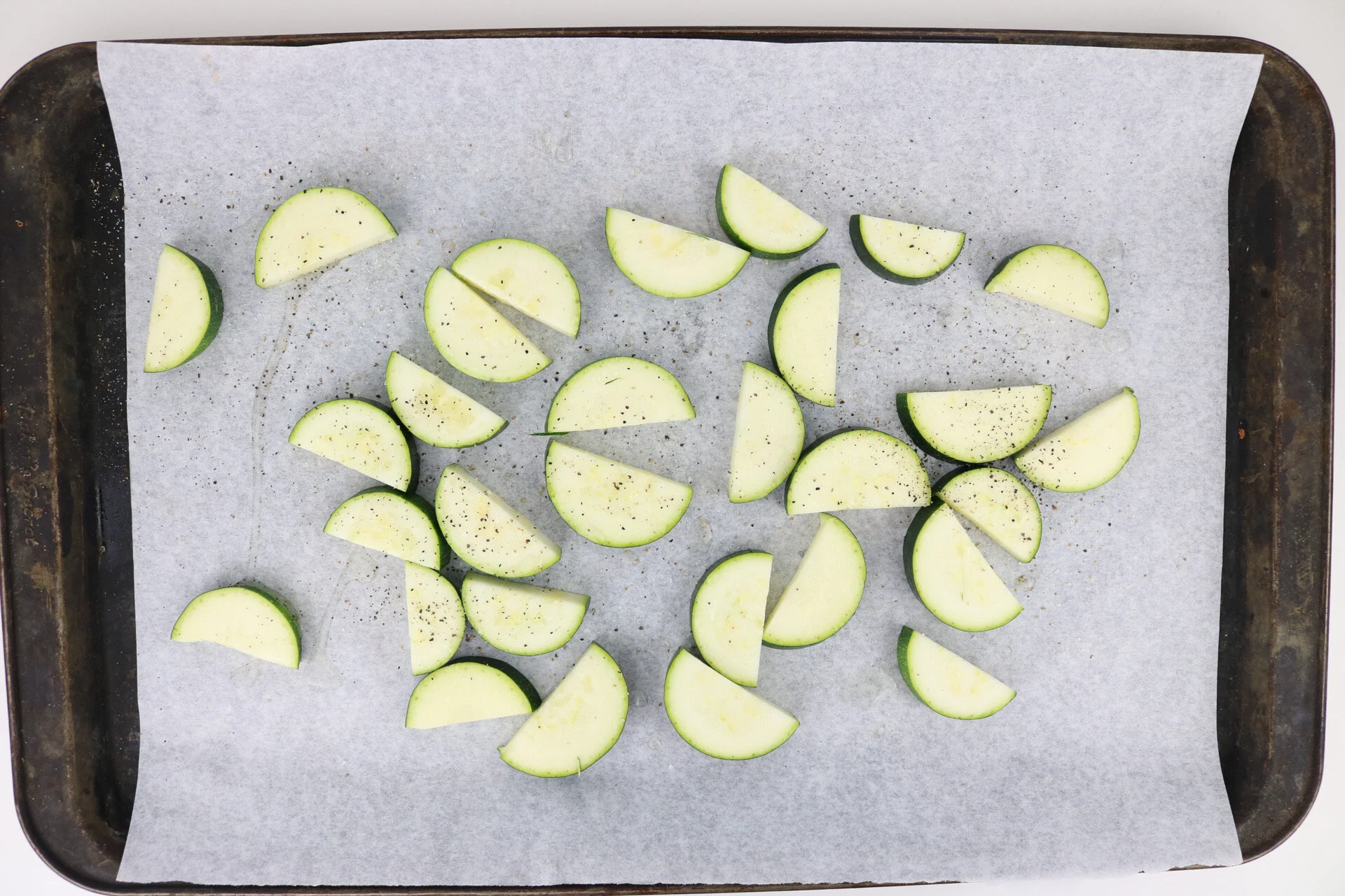 Remove your zucchini from the bag and cut as shown below. Then, toss in olive oil + salt and pepper and transfer to baking sheet. Place the baking sheet in the oven and let cook for ~12 mins.