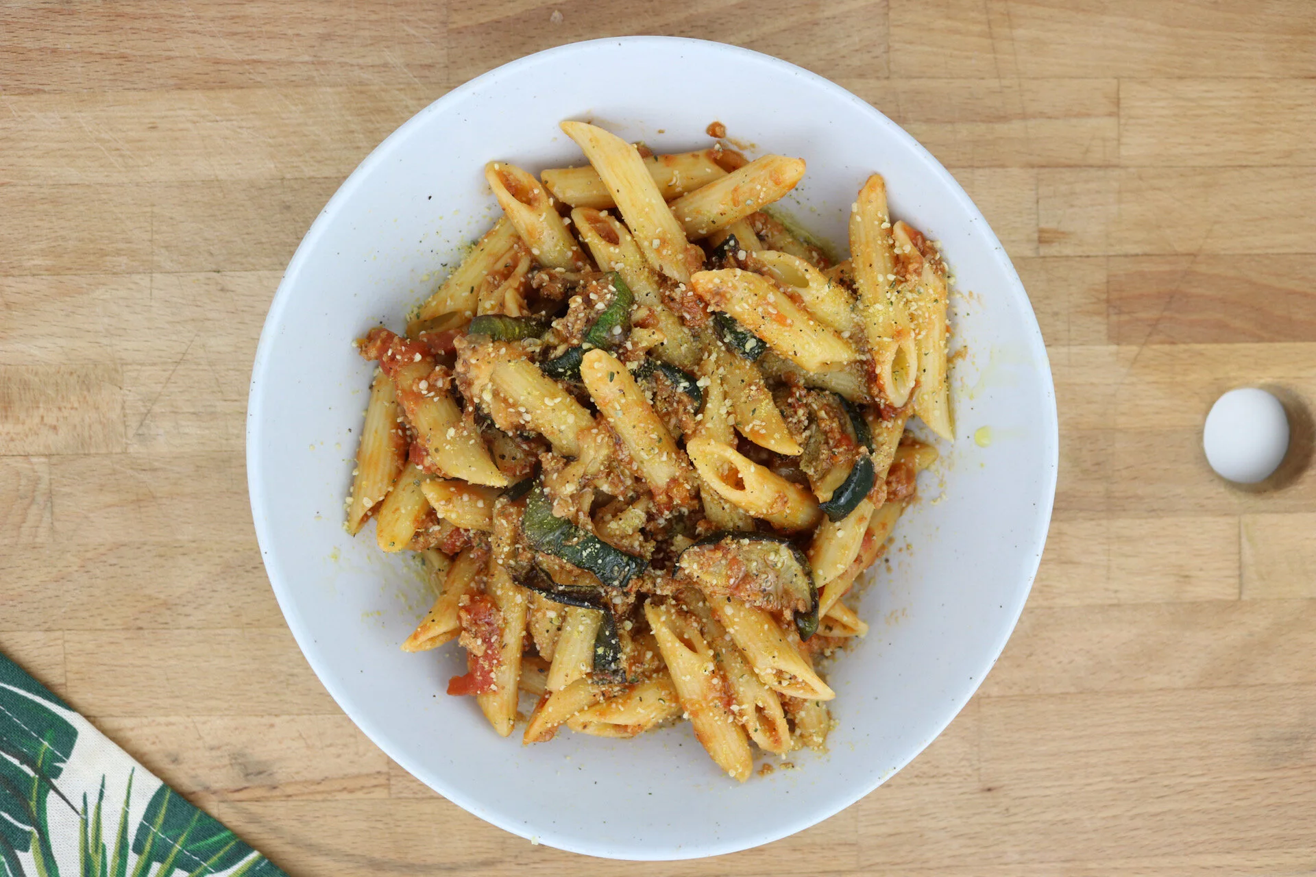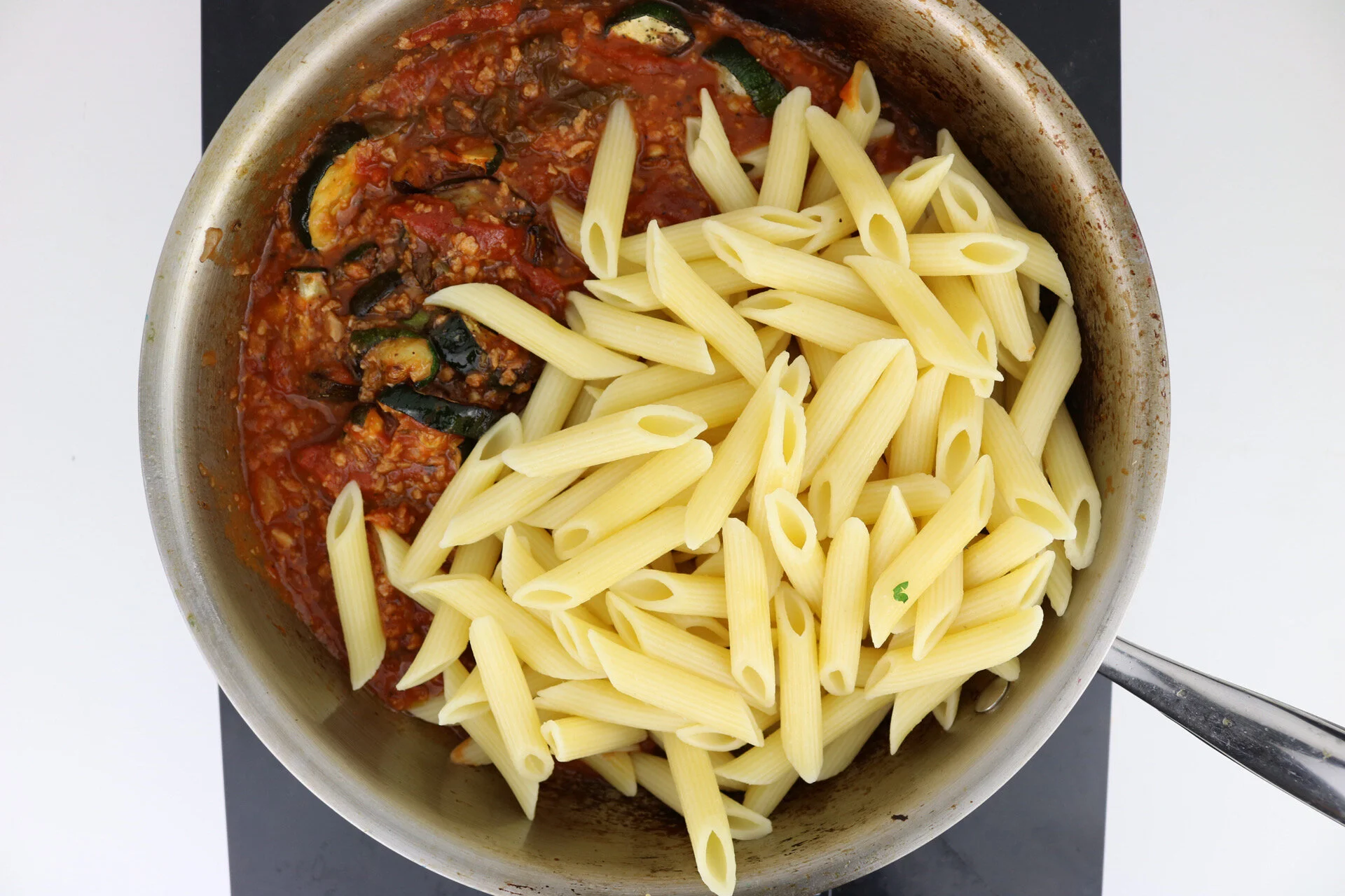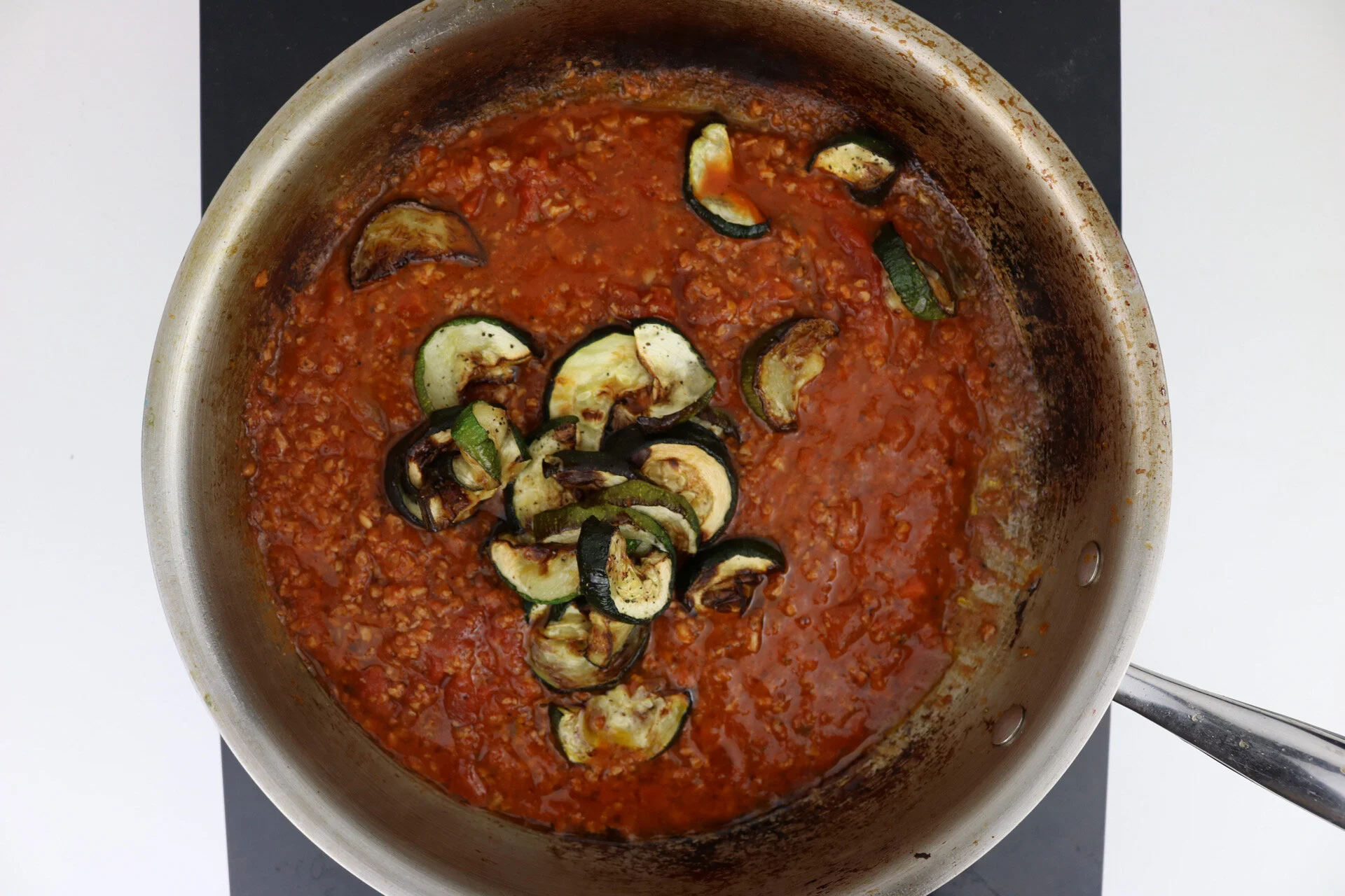 With just a few minutes left on your zucchini, bring a large pan with a splash of oil up to medium-high heat. Add in your sauce, mix, and cook for 7 mins, just until it starts to bubble on the side. Then, add in your baked zucchini, stir to incorporate, then add in your strained pasta. Stir regularly while cooking for another 5 mins.