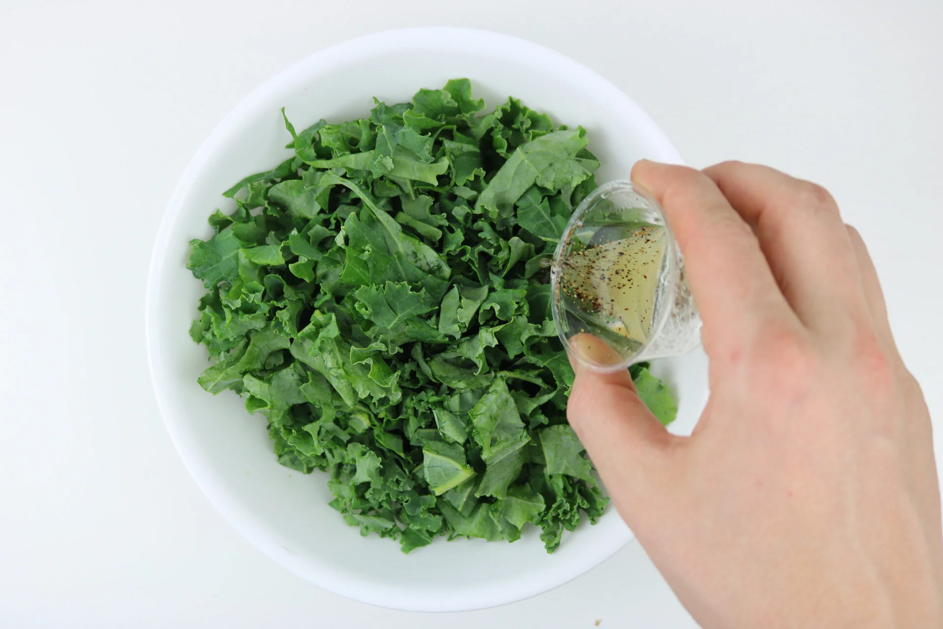 Give your kale a quick wash, then chop it into smaller pieces, and remove any stems. Add in your lemon dressing, and massage it into the kale as best as you can. Leave it off to the side until all of the other ingredients are done.