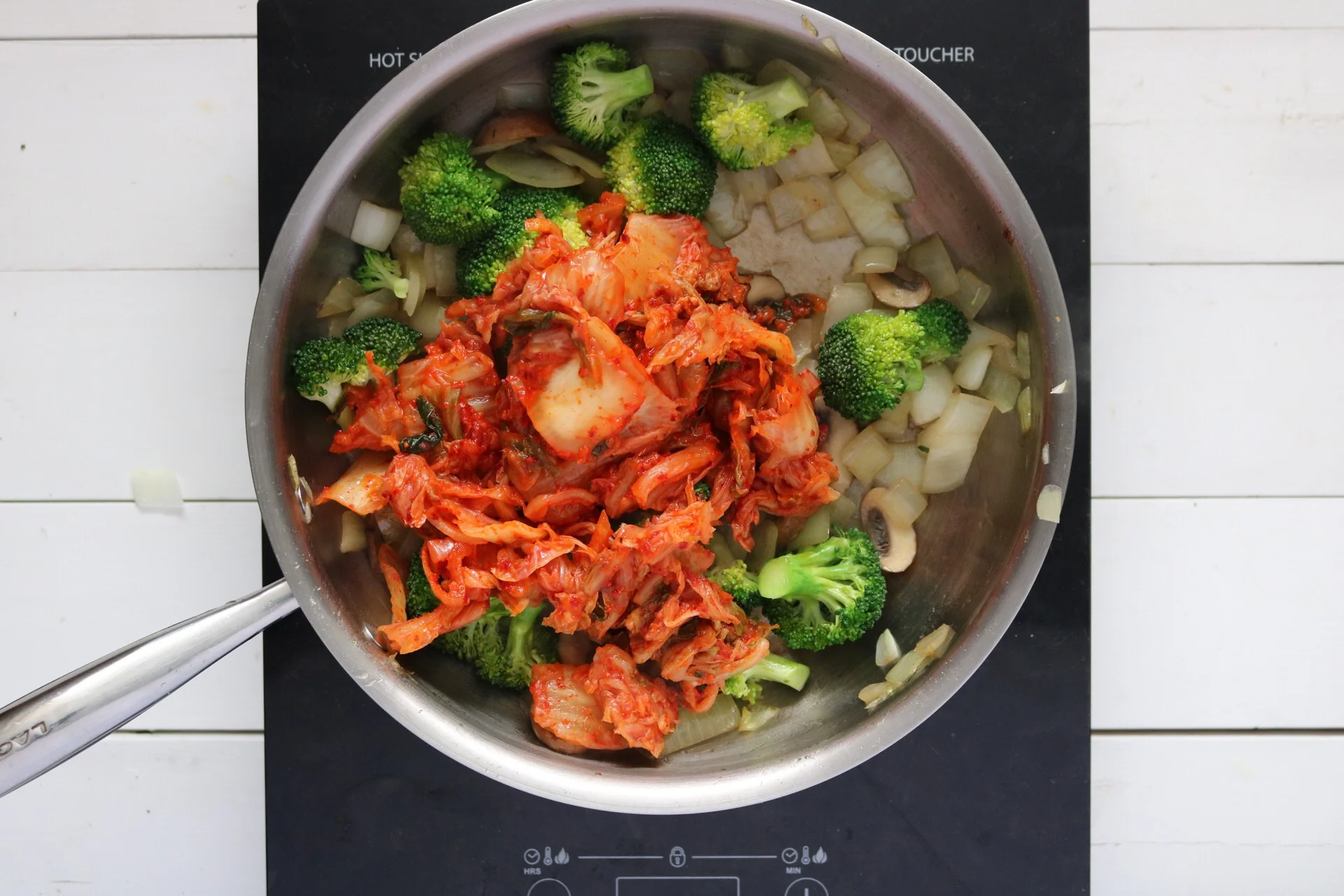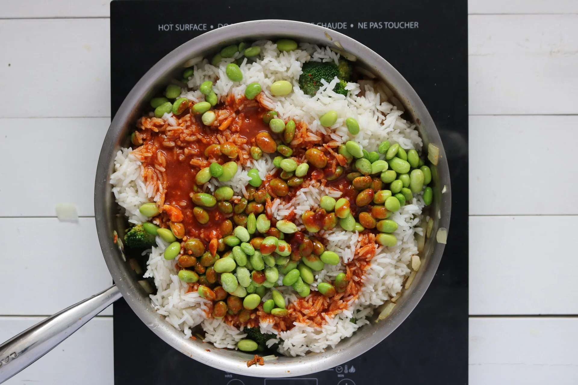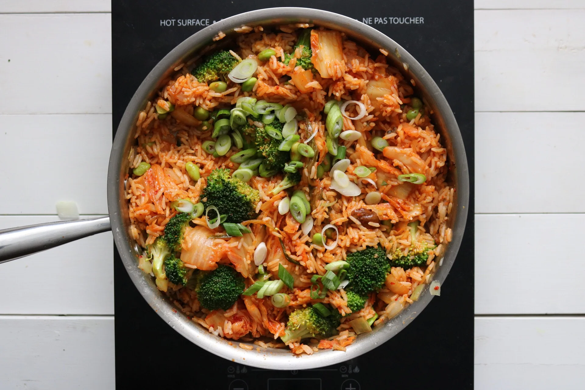 Bring a large pan with 1 tbsp of oil up to medium heat. Once hot, add in your mushroom and your onion, cook for 4-5 minutes until they just start to brown and soften. Next add in your broccoli & kimchi, cook for another 5 minutes. When your rice is finished add it in with your pan mixture along with your edamame and your sauce, stir until everything is fully coated ~ 5 minutes. Right before you finish add in half of your green onion and mix quickly.