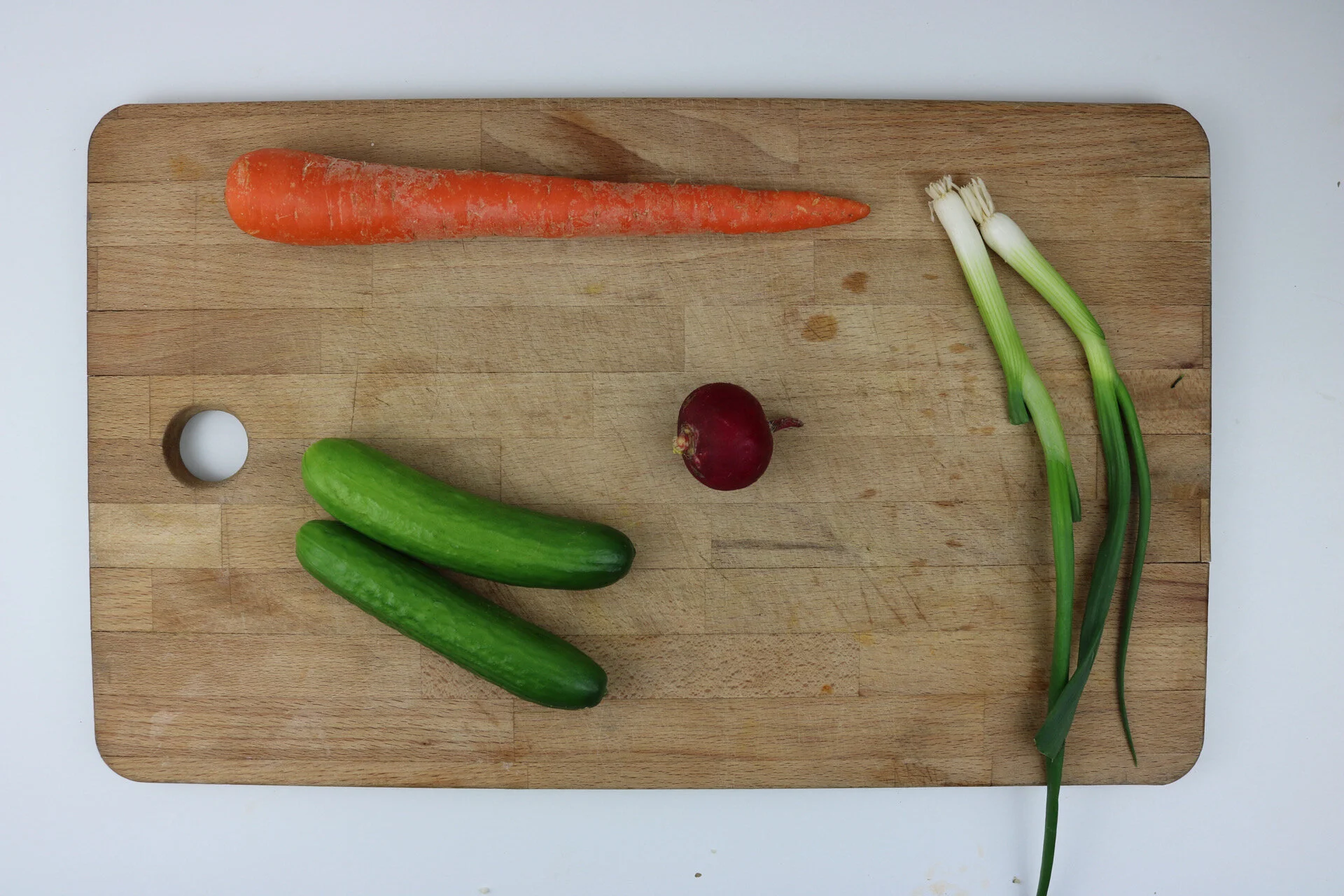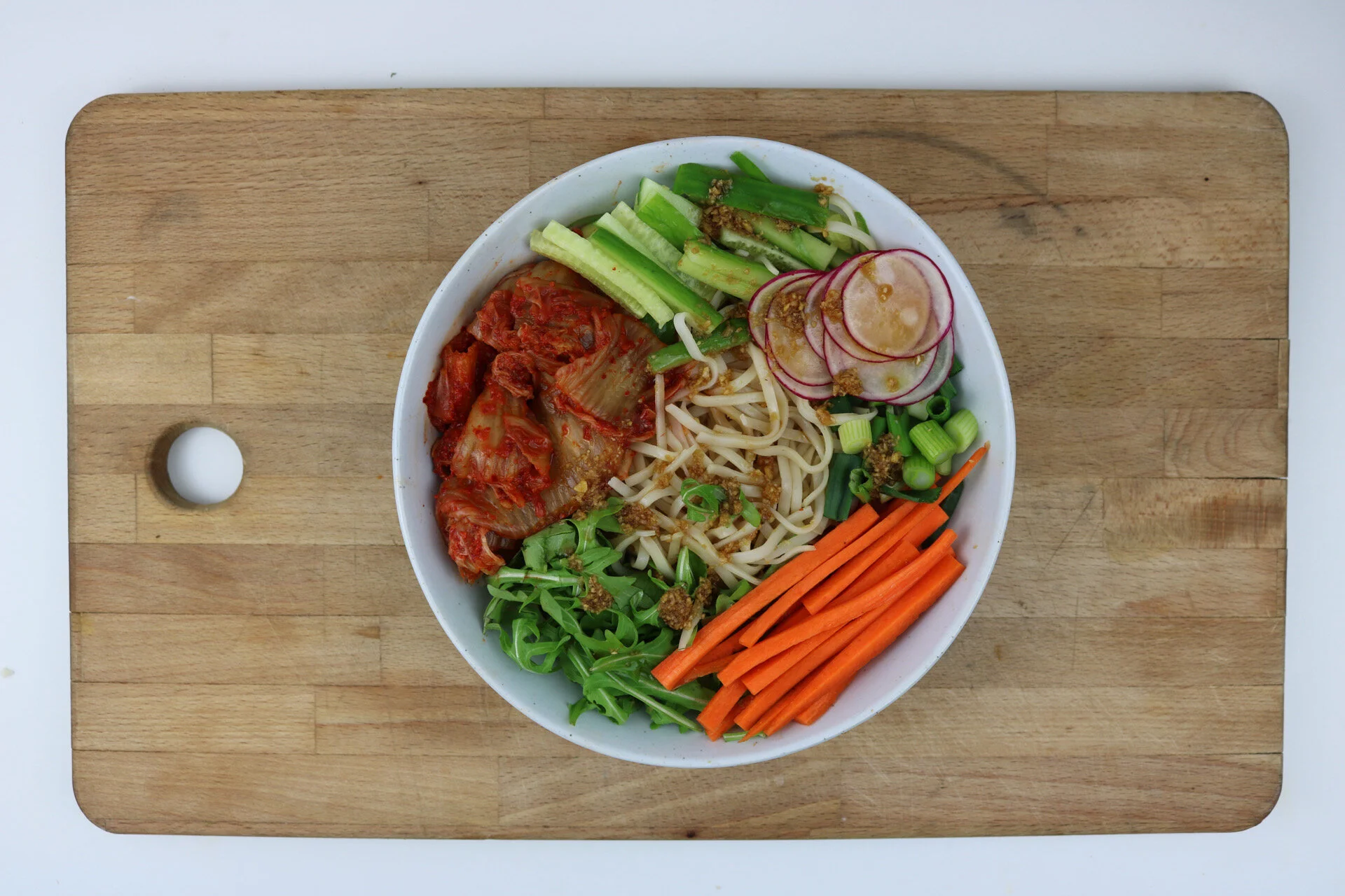ingredients: rice noodles, kimchi, cucumber, carrot, arugula, radish
