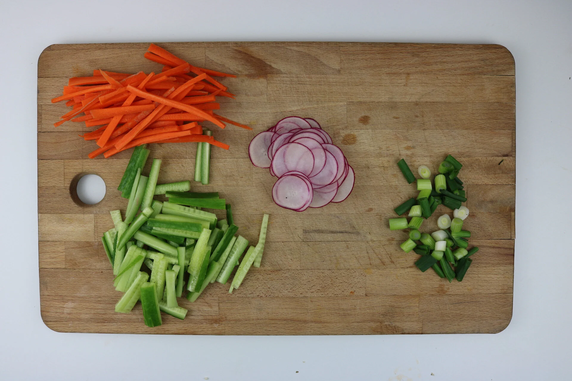 Bring a large pot/kettle of water up to a boil. Once boiling, cover your rice noodles with the water and let them cook for 7- 9 minutes or until there is no crunch when trying it. Once done, carefully strain, then run the noodles under cold water until they’re cold to the touch to stop the cooking process. Set aside.