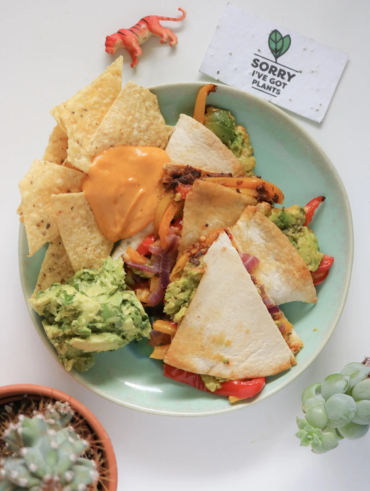 black bean quesadilla + guac, queso & chips