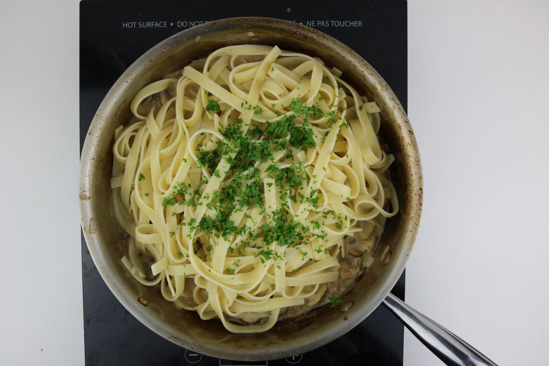 Next, add in your stroganoff sauce, and cook for ~1 min, stirring constantly.