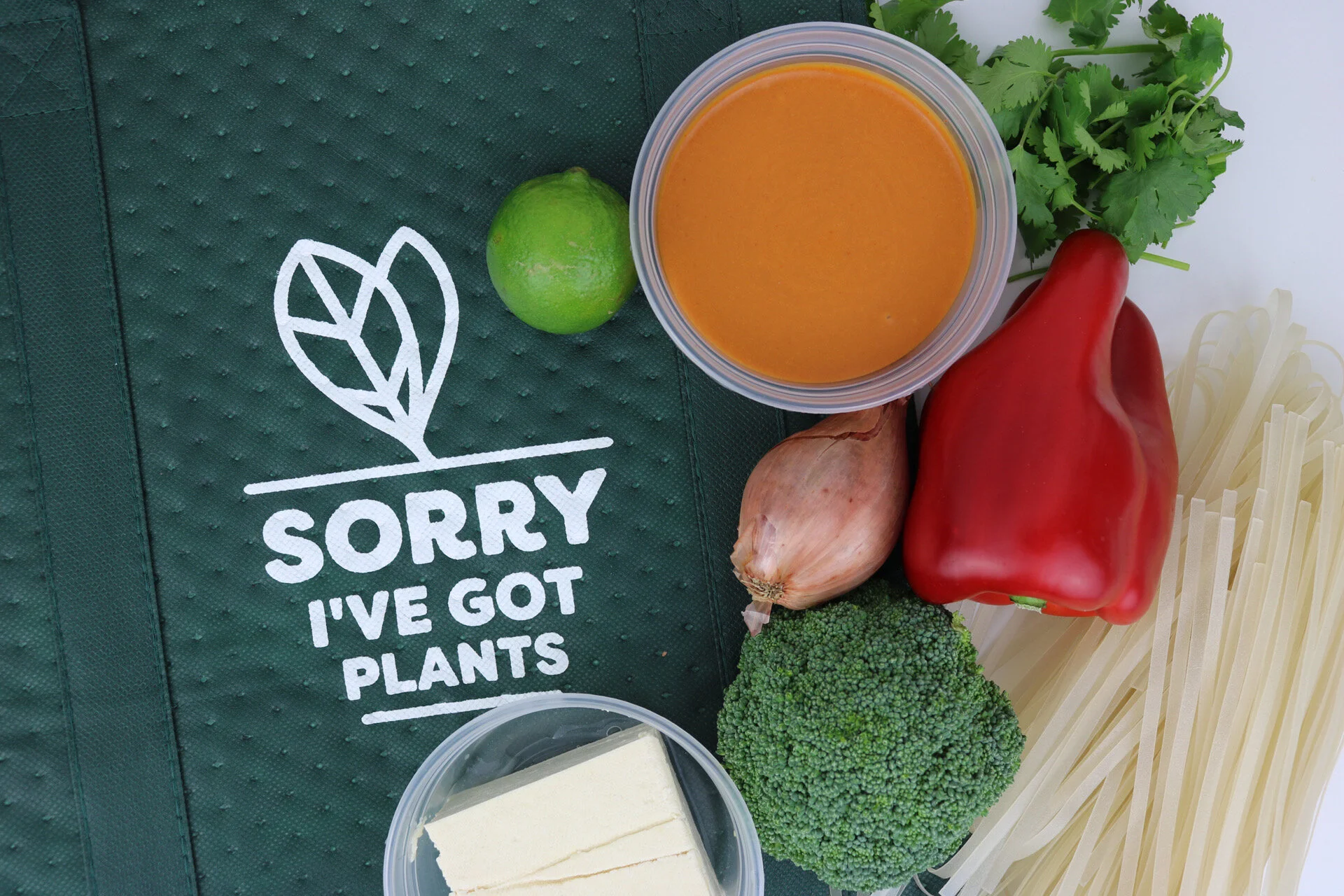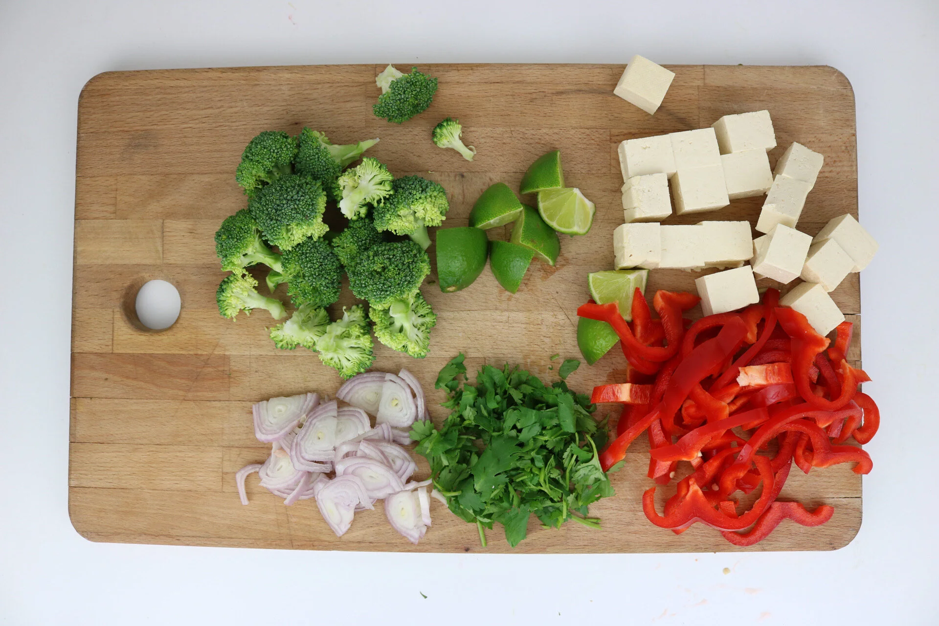 ingredients: rice noodles, shallot, red pepper, lime, tofu, broccoli