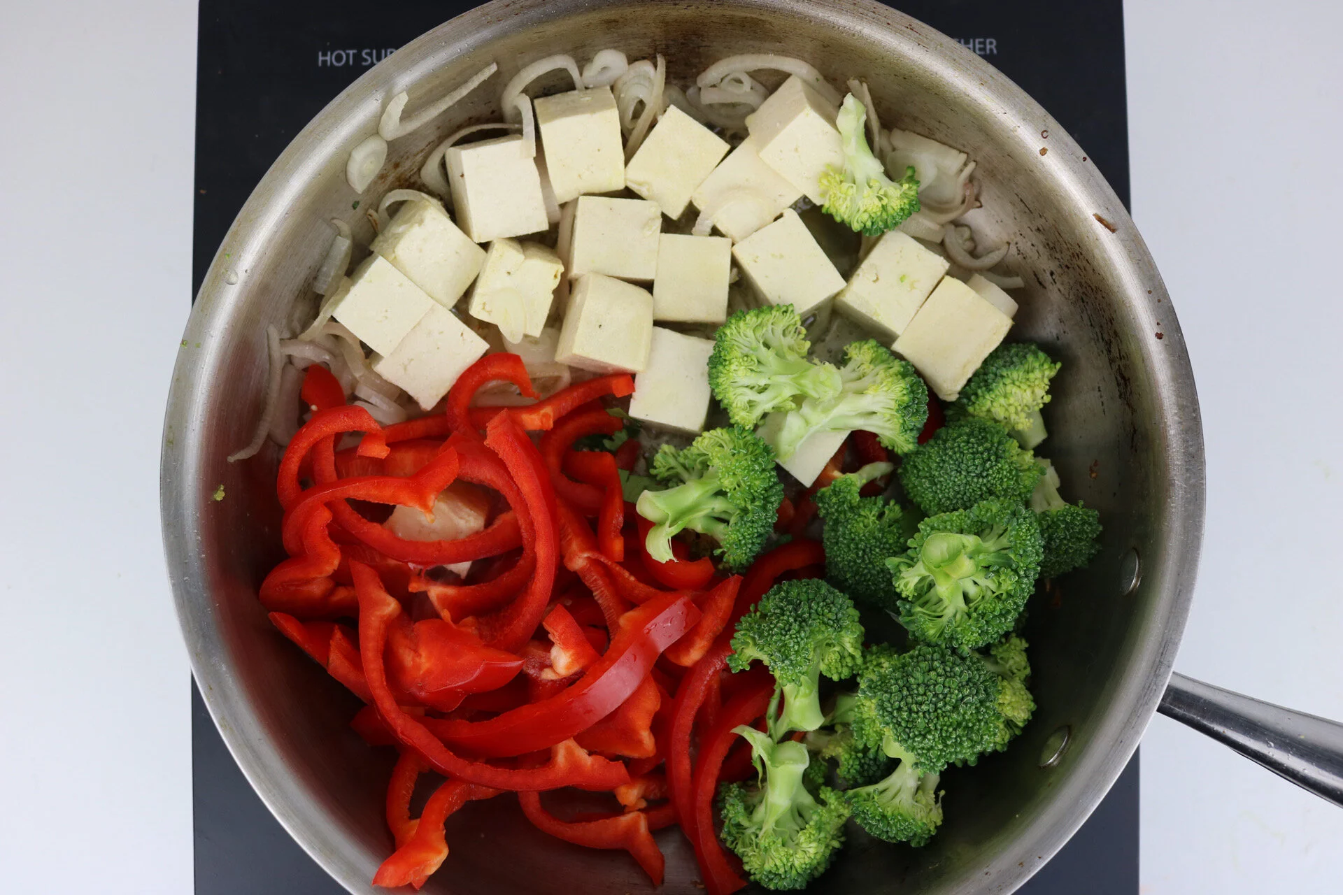In a large sauce pan, bring 2 tbsp of oil up to medium-high heat. Once hot, add in your tofu and your onion, and let them cook for 5-7 minutes. Next, add in your broccoli + red pepper and cook everything for another ~5 minutes. Bring the heat down to a simmer, then add your sauce and your noodles. Keep stirring until the noodles are fully coated in sauce and there is no residual sauce left in the pan, ~ 5 more minutes.