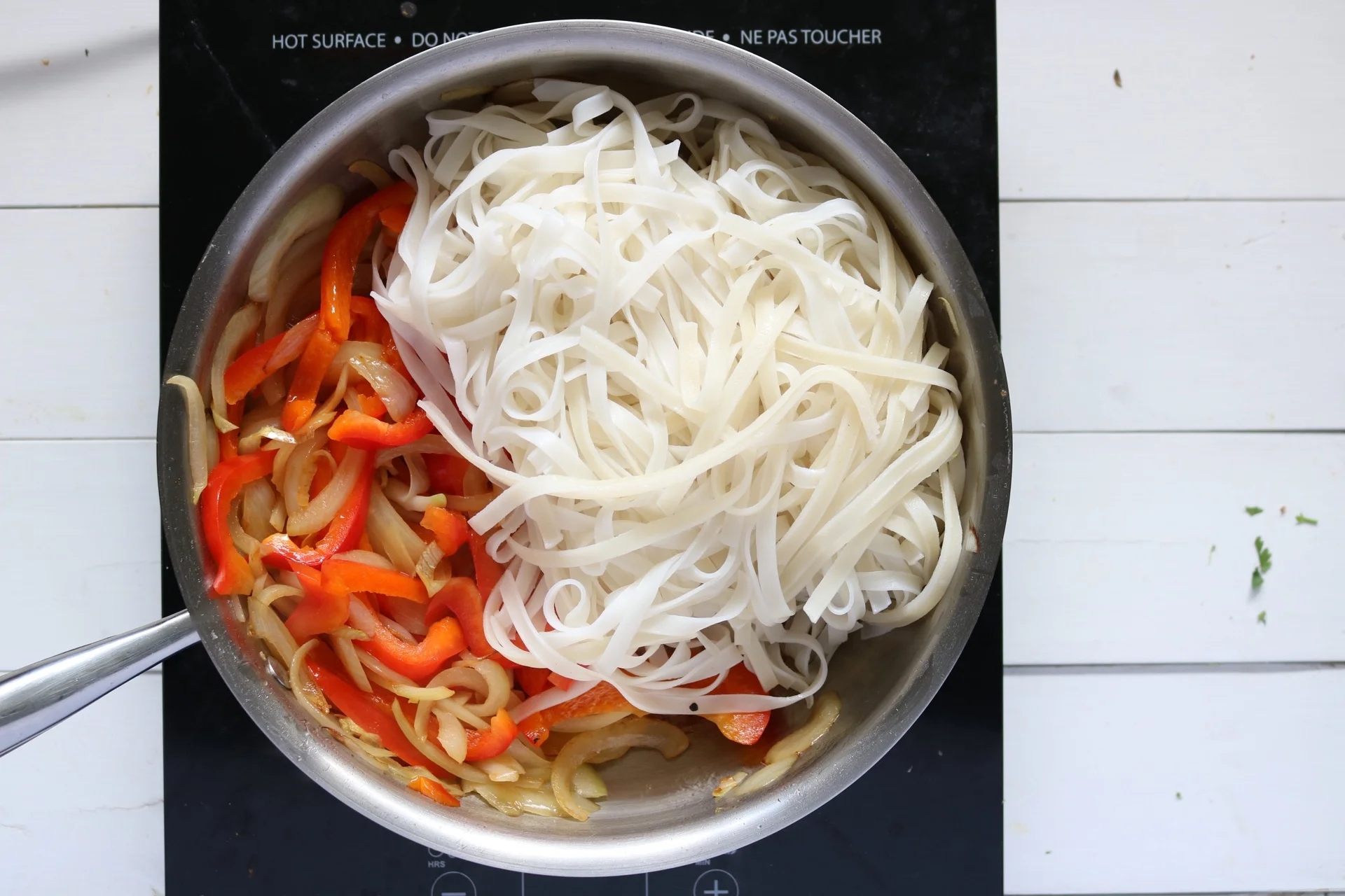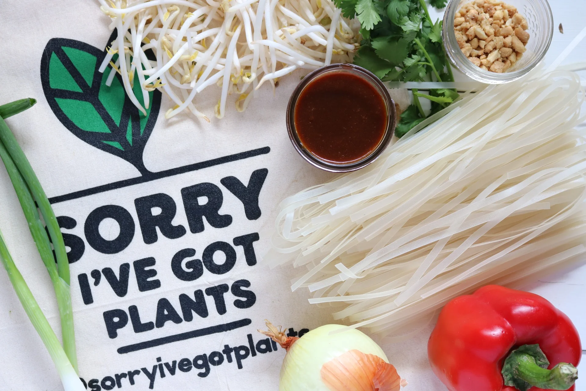 ingredients: rice noodles, red pepper, onion, cilantro, bean sprouts, peanuts ( in container)