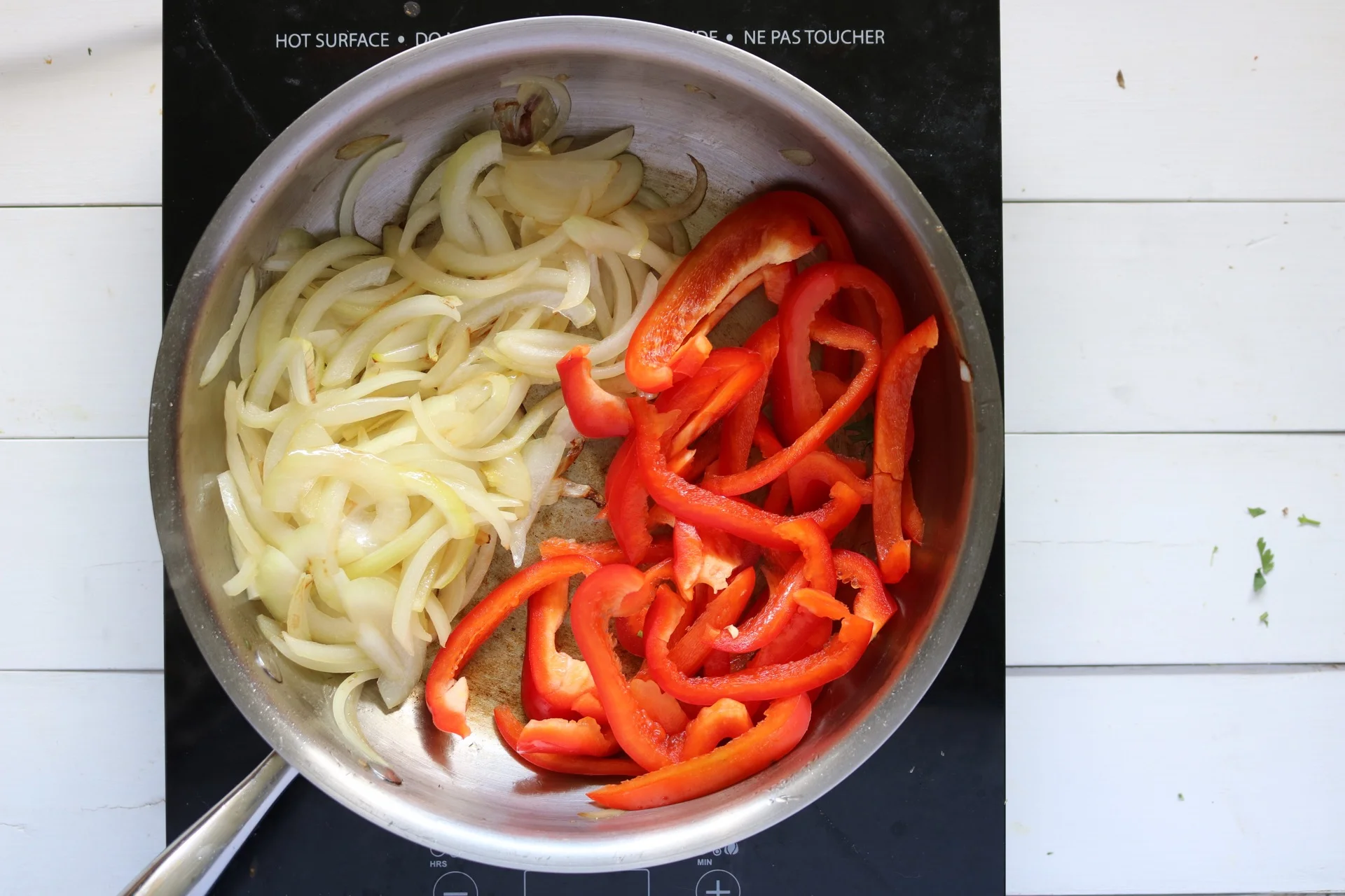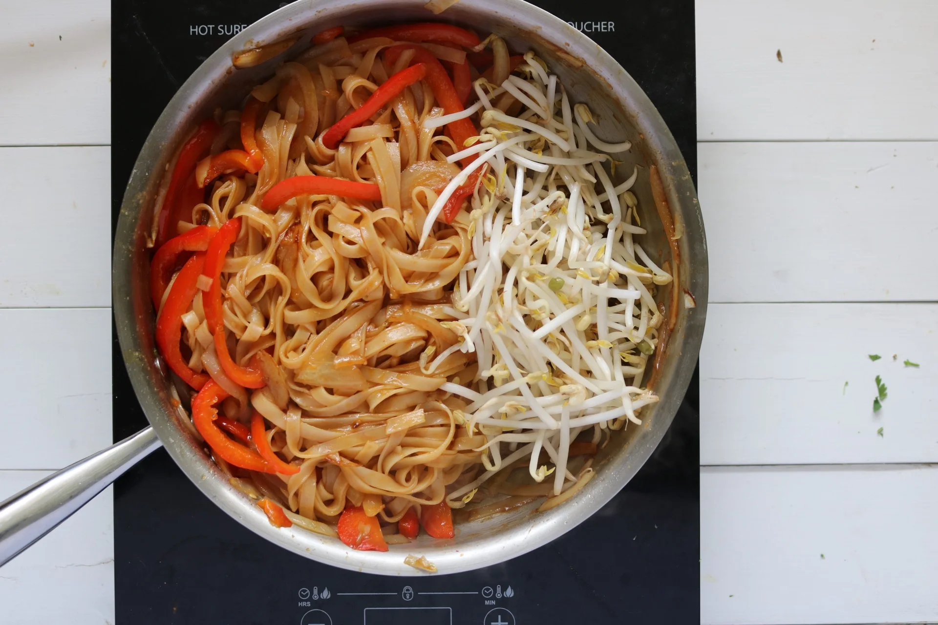 In a large sauce pan bring 2 tbsp of oil up to medium high heat. Once hot add in your onion and your red pepper, let cook for 5-7 minutes. Next add in your noodles and your sauce mixing regularly for the next 5 minutes until the noodles are hot and the sauce has begun to thicken up. Before finishing add in your bean sprouts and cook quickly for 2 minutes.