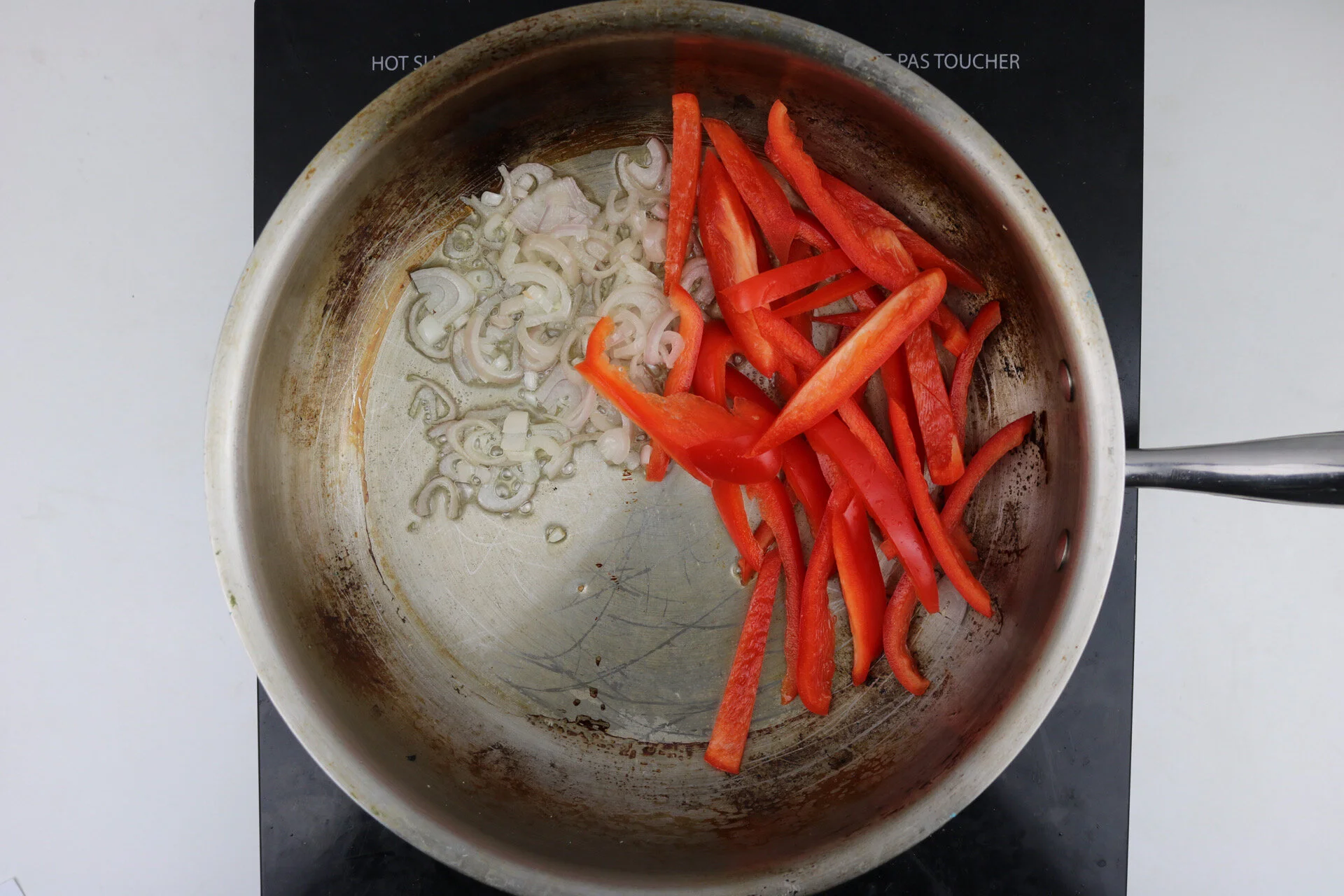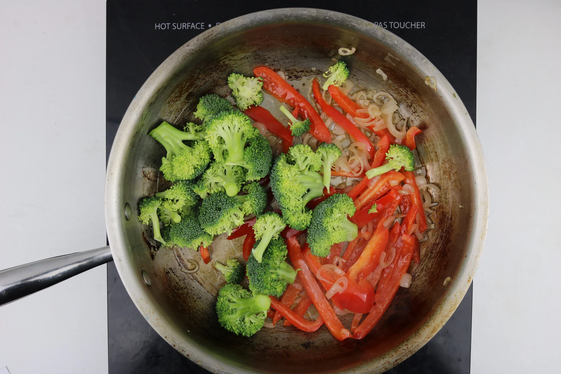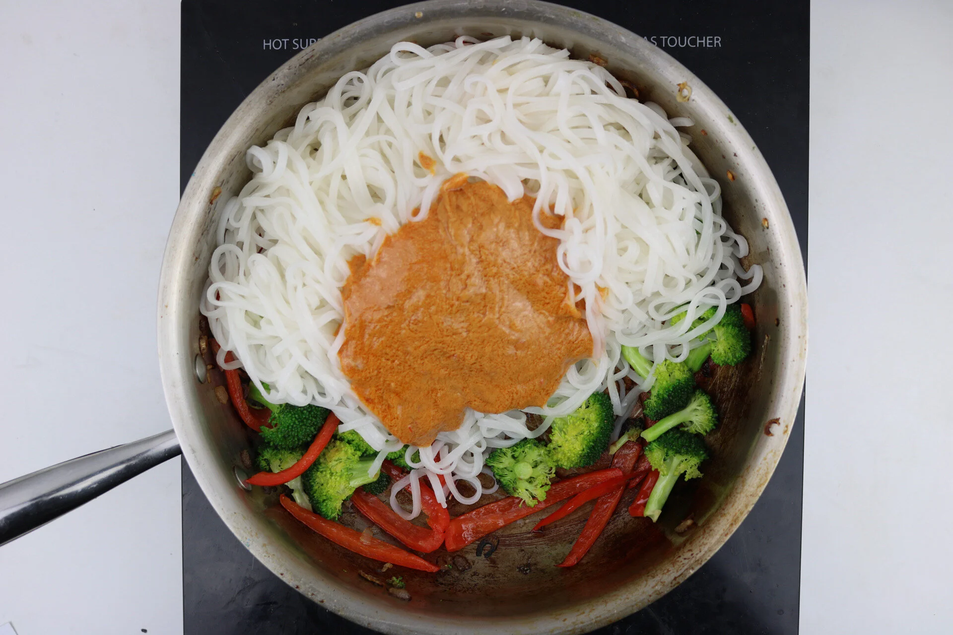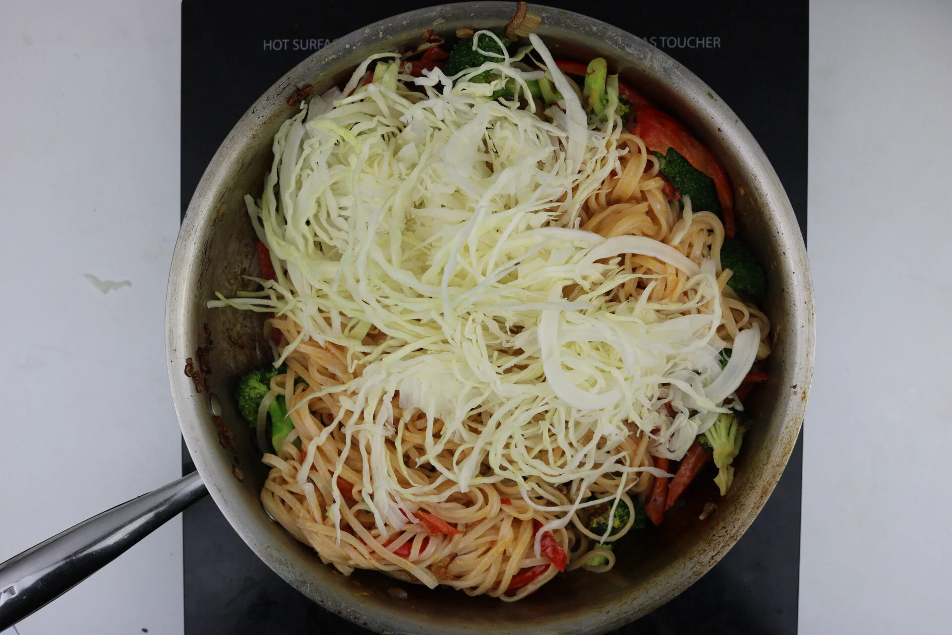 ingredients: shallot, red pepper, white cabbage, rice noodles, broccoli
