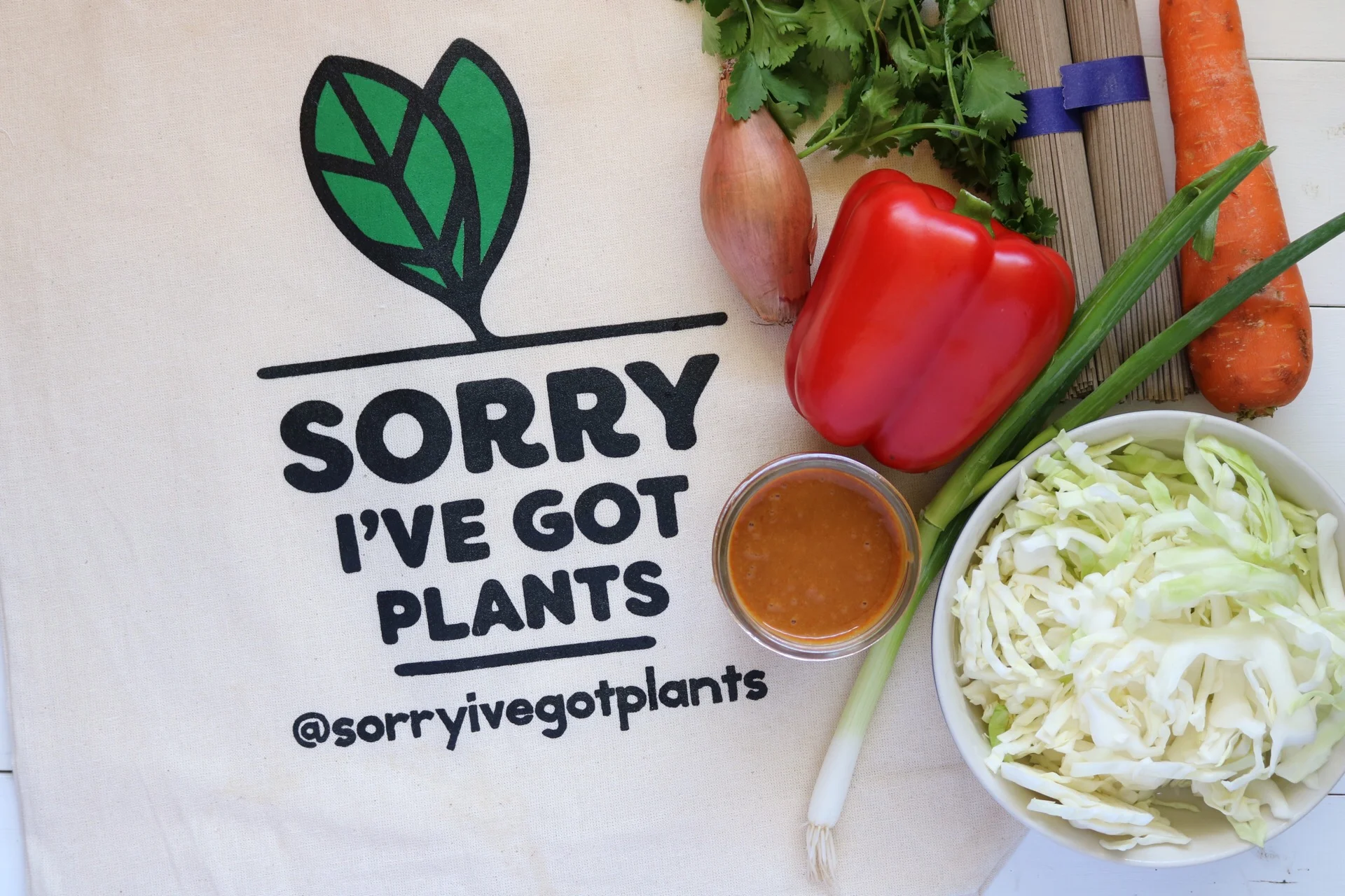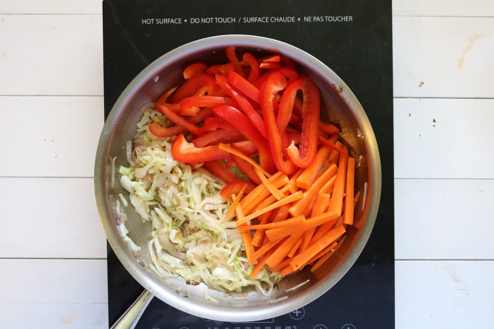 Bring a large saucepan + 2 tbsp of oil up to medium-high heat. Once hot, add in your shallots and cabbage and cook for ~ 5 mins, until they start to brown. Next, add in your red pepper and carrot, and cook for another ~7 mins. Turn the heat down to low, then add in your noodles + sauce, toss thoroughly, and cook for another 2 mins.