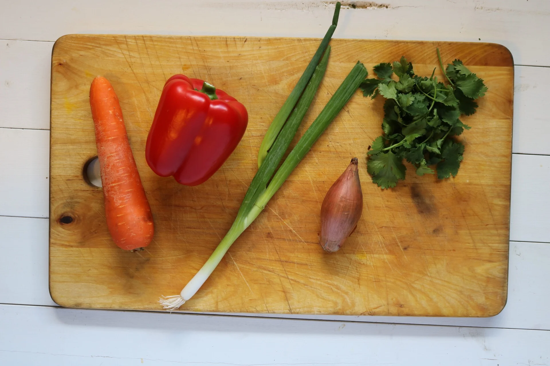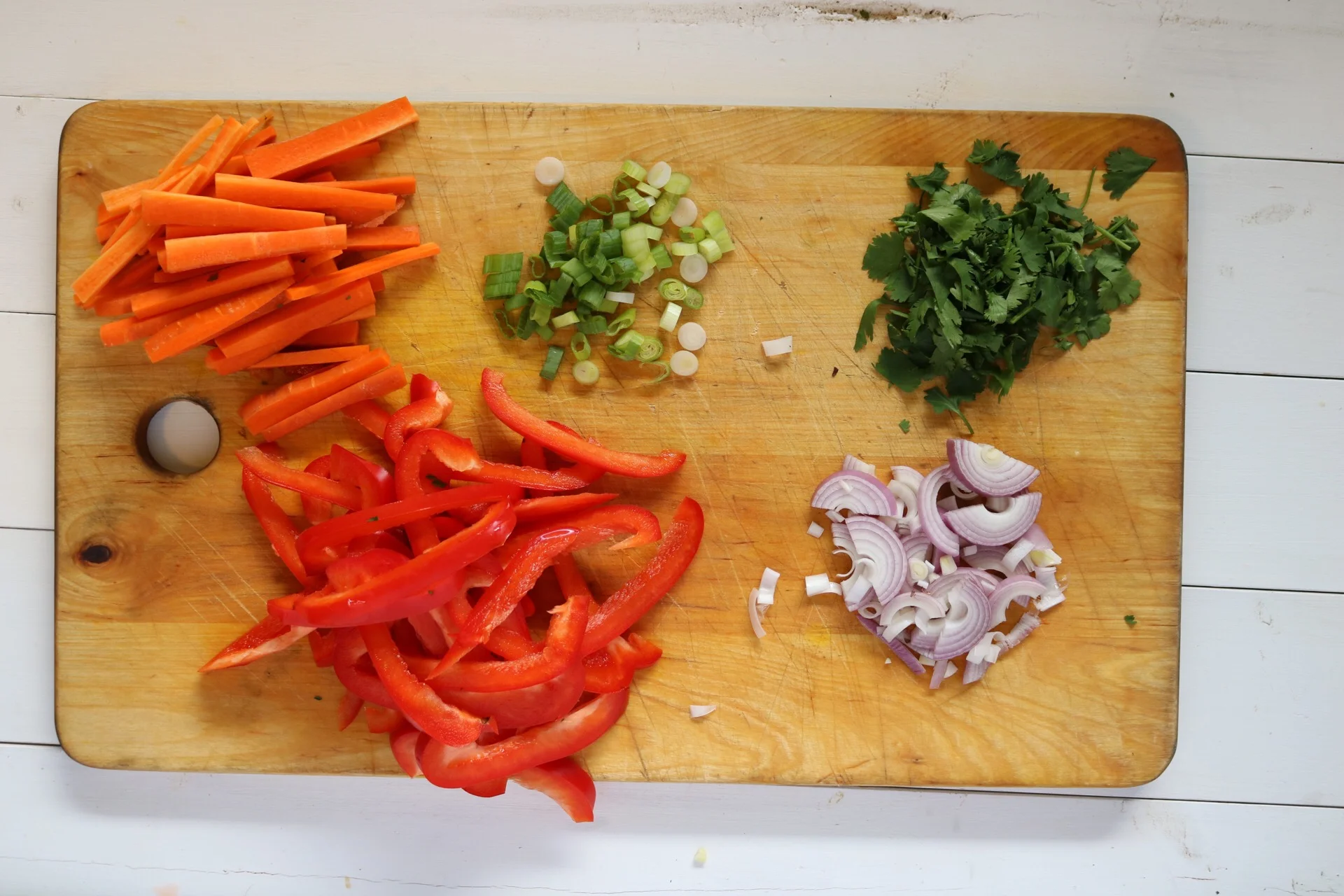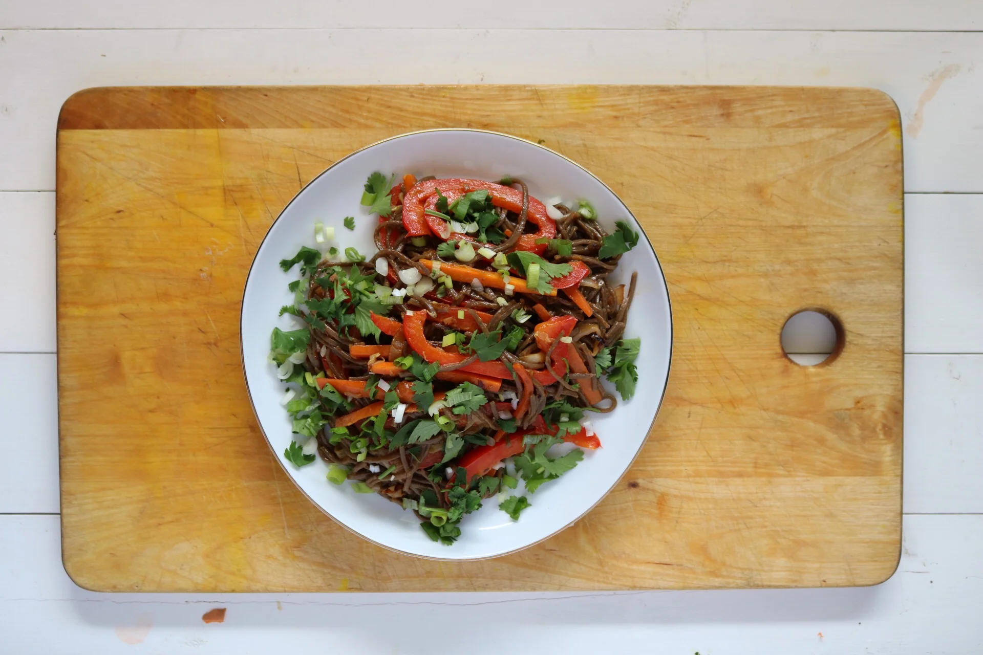 Ingredients: buckwheat soba noodles (GF sub: rice noodles), red pepper, carrot, green onion, cilantro, white cabbage