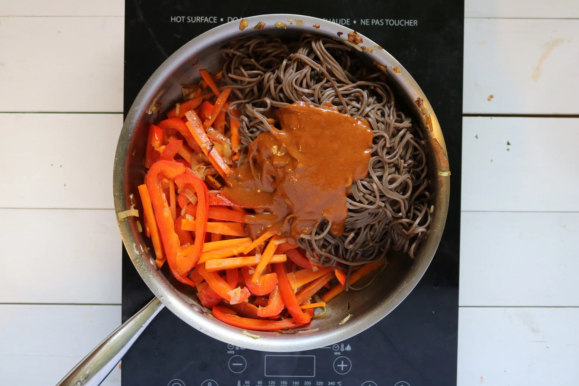 Bring a medium pot of water + a pinch of salt up to a boil. Once boiling, add in your soba noodles and cook for ~12 mins. Once done, run your noodles under cold water to stop the cooking process, then set aside.