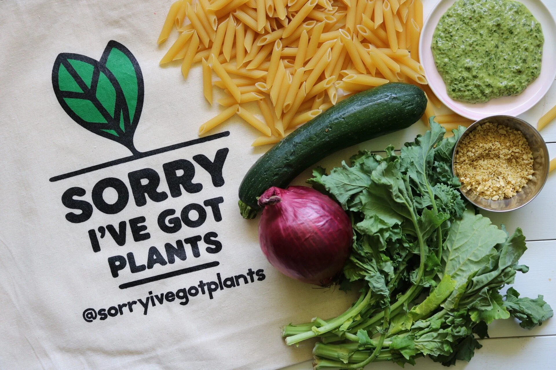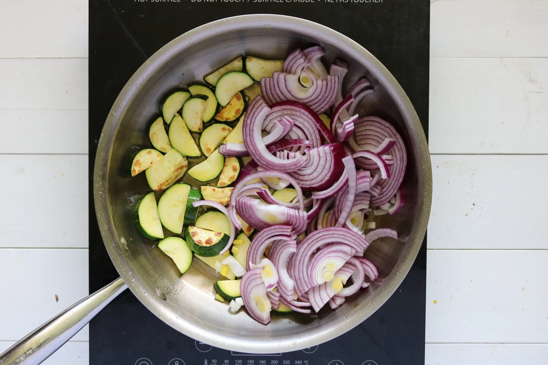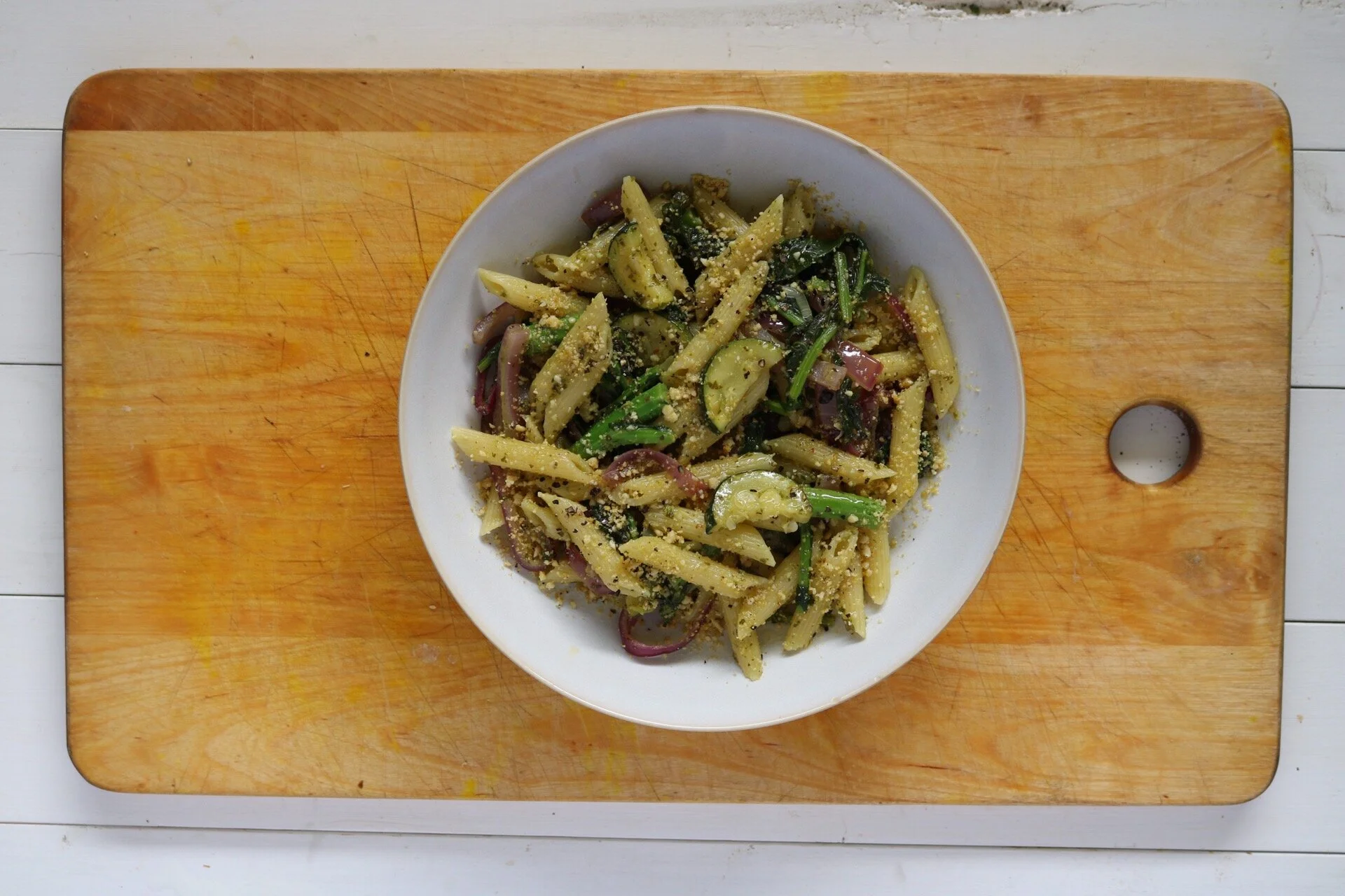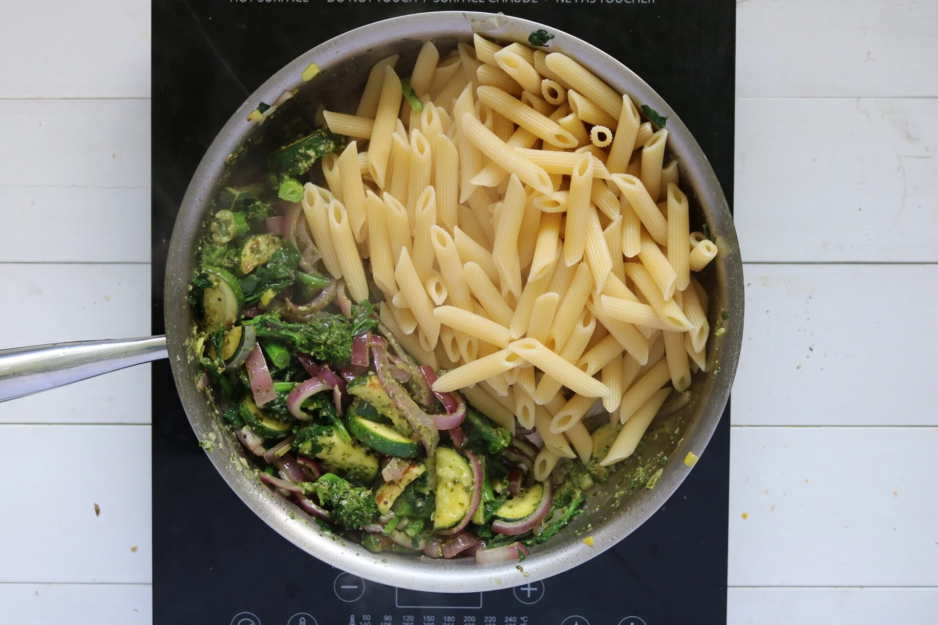 Bring a large pan with a splash of oil up to medium high heat. Add in your zucchini and cook for 5 minutes until it starts to brown. Then add in your onion and cook for another ~ 4 minutes. Next your boiled rapini + your pesto and stir for just a minute or two before mixing in the pasta, let everything come together for stirring constantly for ~ 5 minutes