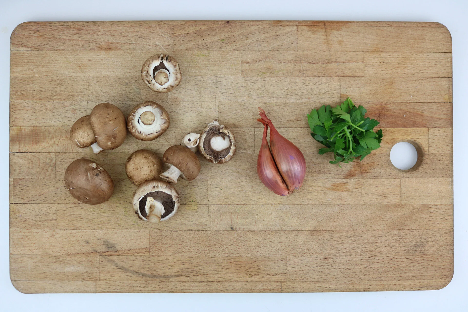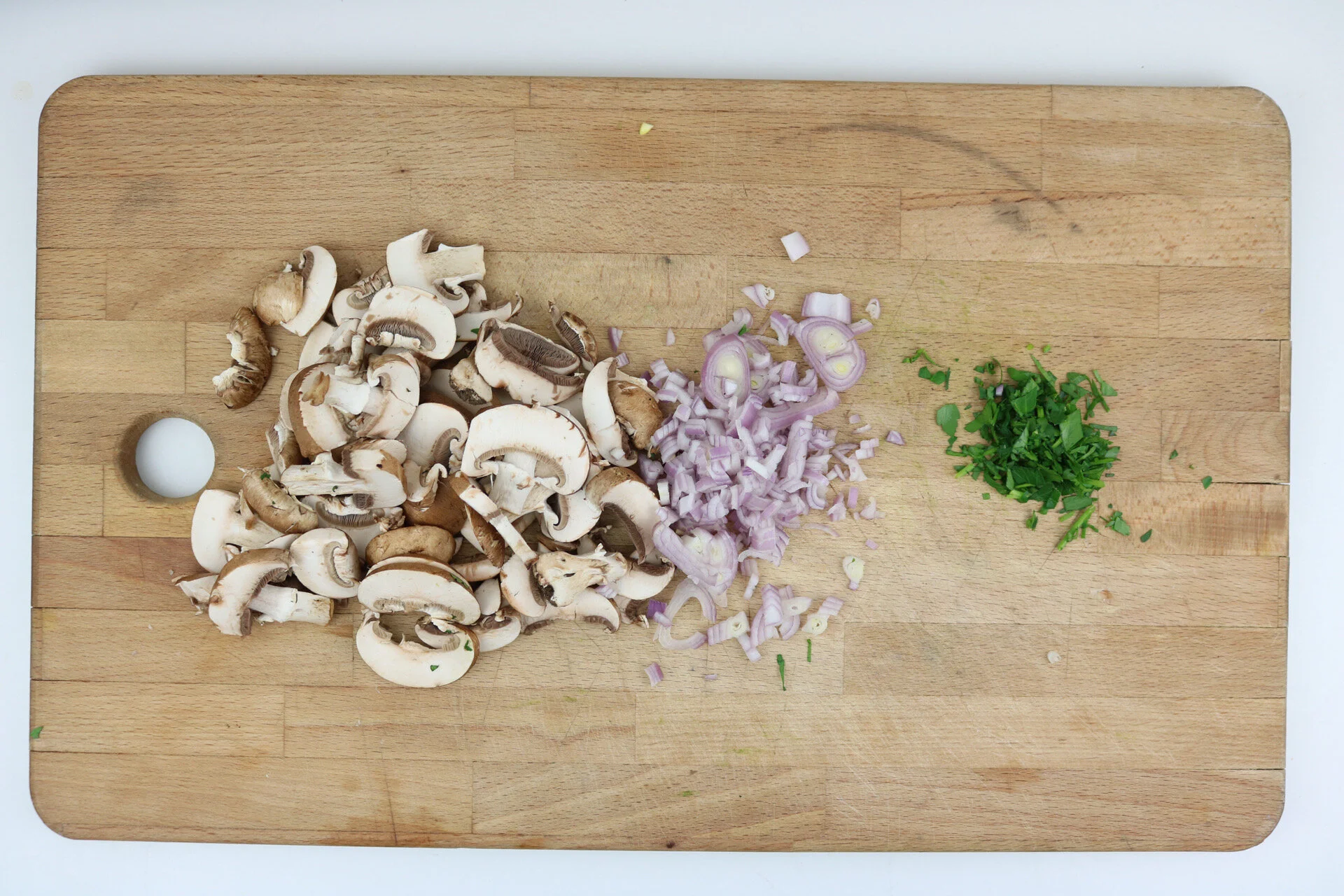 Bring a large pan with a splash of oil up to medium-high heat. Add in the diced shallot and cook for 2 mins, until they start to brown. Then, add in your mushrooms and cook for another 5 mins.