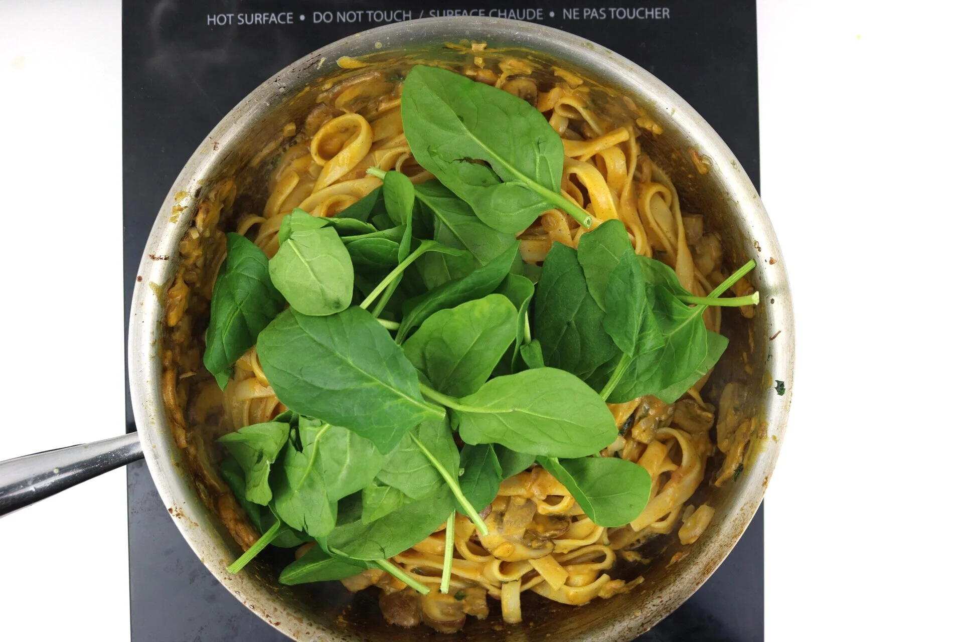 Add in your pasta + spinach, and stir until fully incorporated and until the spinach has wilted. Cook for another ~2 mins, until the sauce thickens.