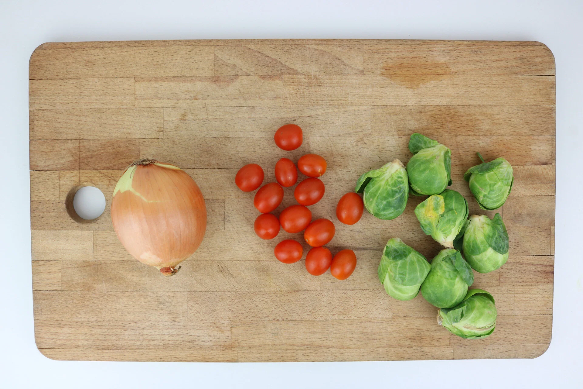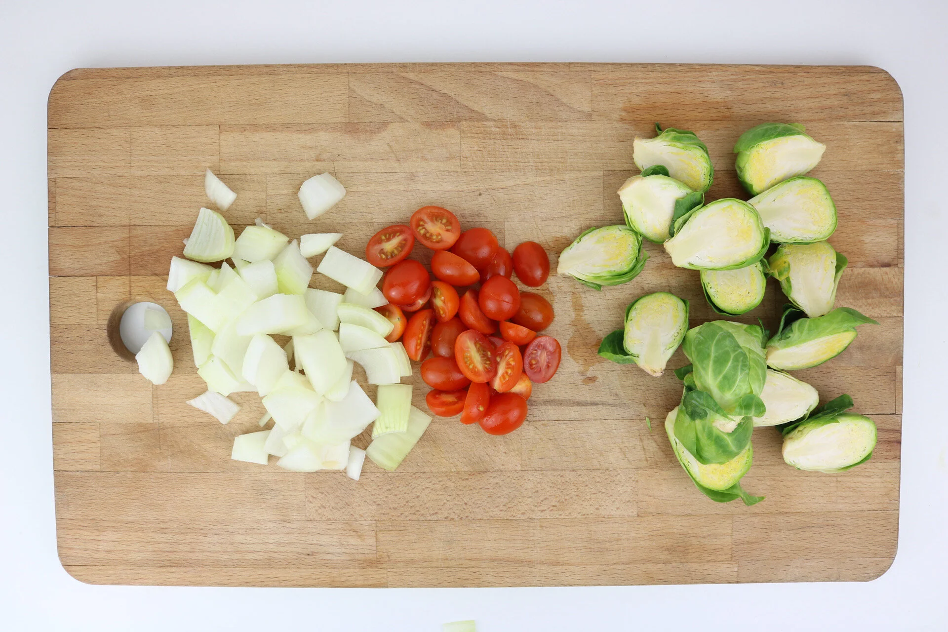 Ingredients: quinoa, onion, chickpeas, cherry tomatoes, brussels sprouts, spinach