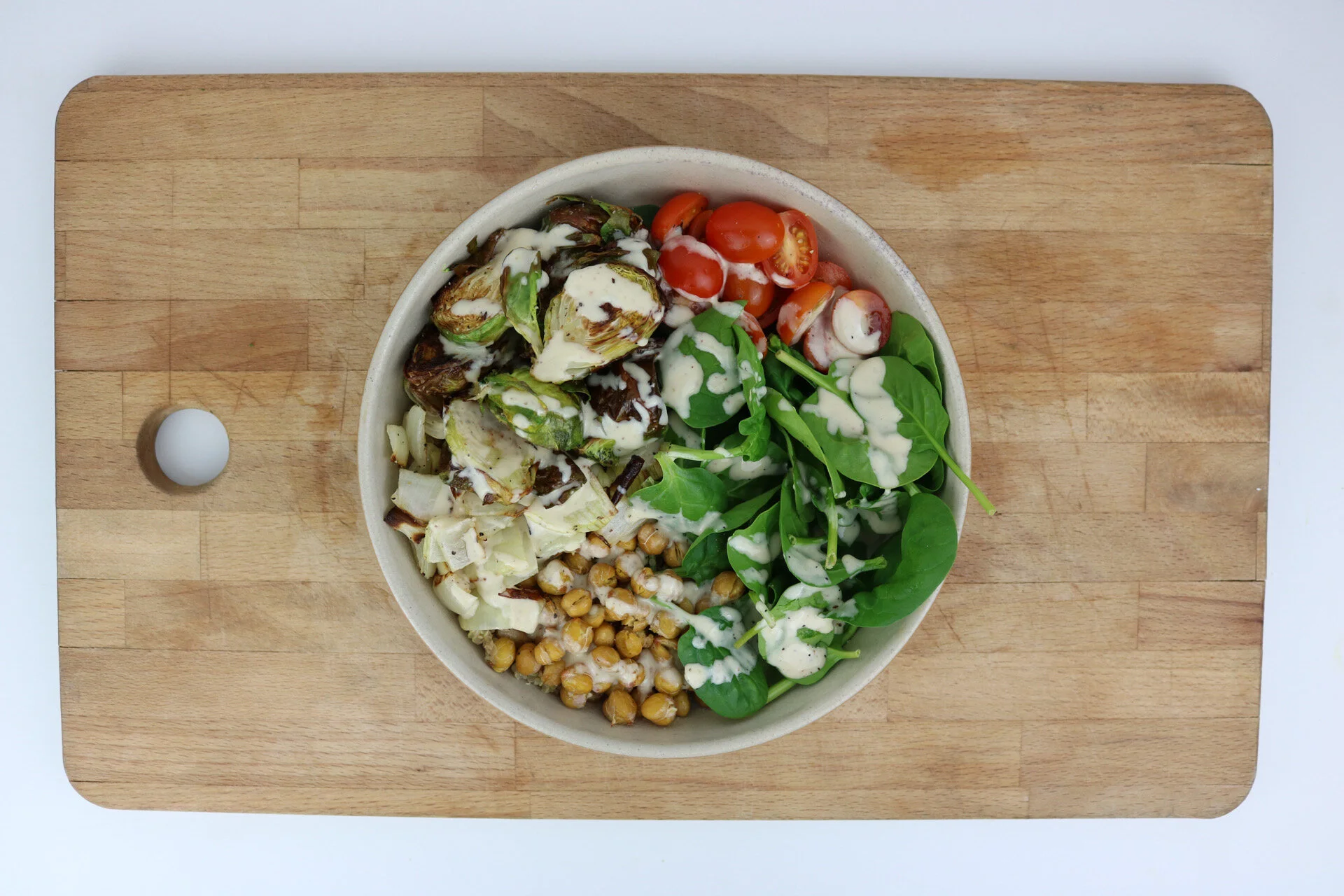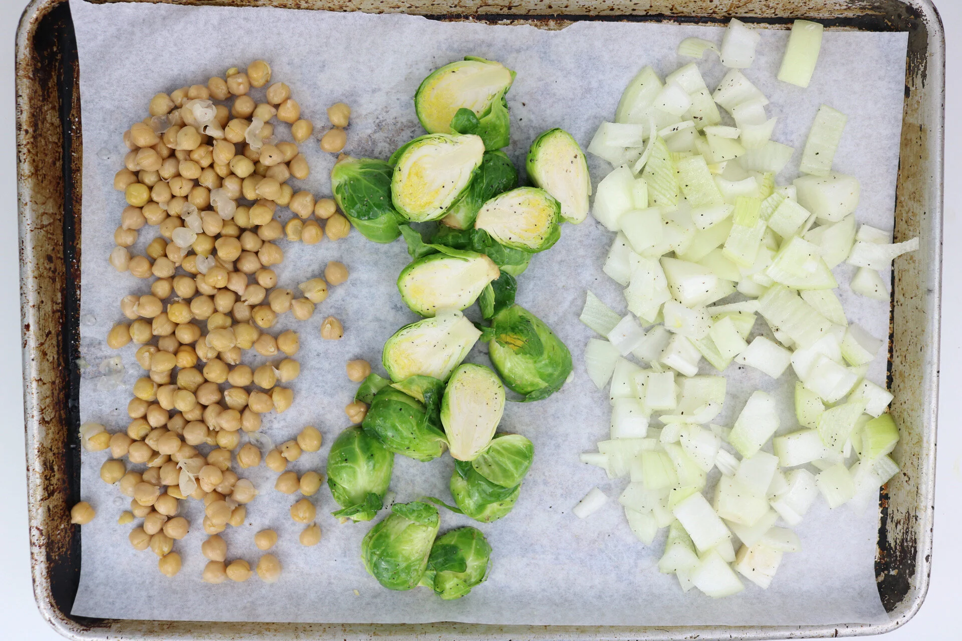 Toss your chickpeas, onion, and brussels sprouts w/ a splash of oil. Transfer to baking skeet and bake for ~18-20 mins.