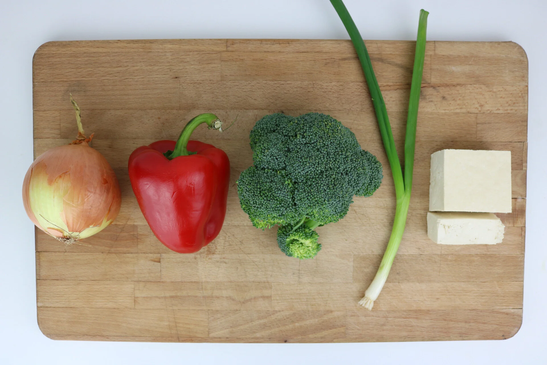 Ingredients: rice, onion, red pepper, broccoli, green onion, tofu
