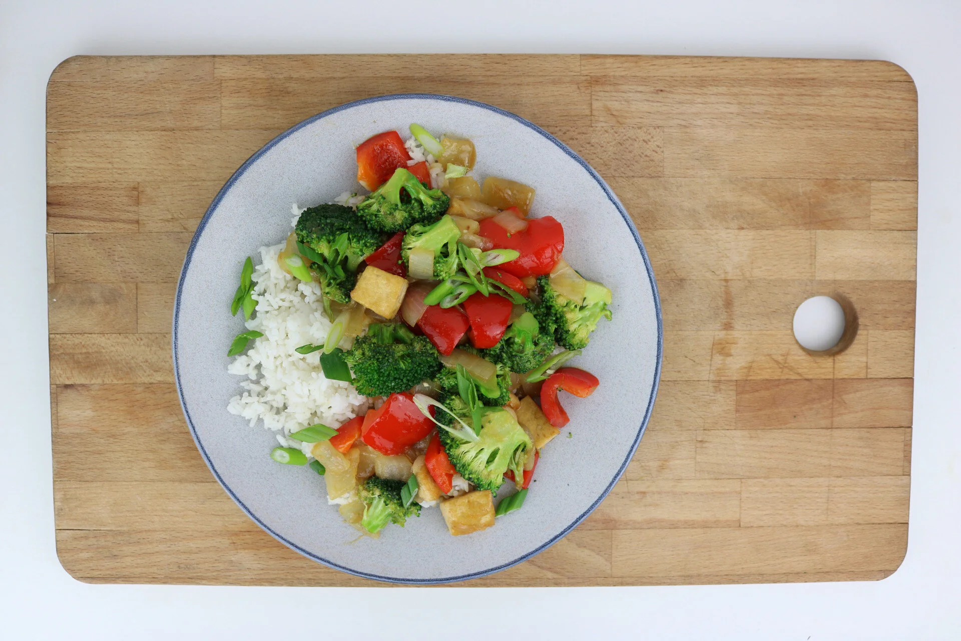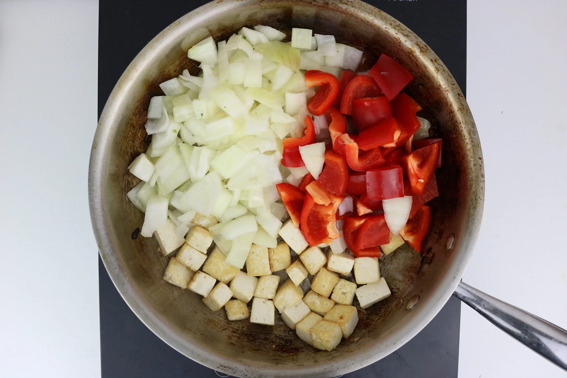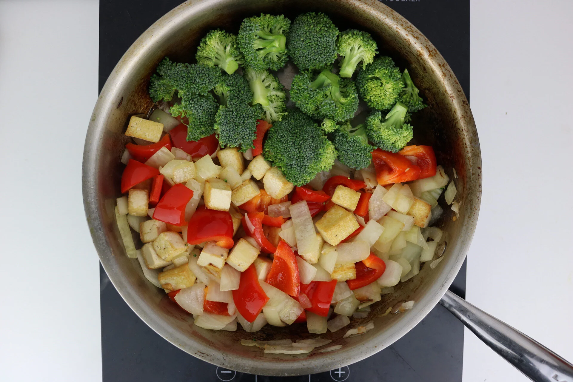 Bring a sauce pan + 1 tbsp of oil up to medium-high heat. Once hot, add in your tofu and let cook for ~4 mins. Next, add in your diced onion and red pepper, and let cook for ~5 mins. Then, add in your broccoli, and cook for another ~5 mins. Finally, add your teriyaki sauce, and let cook for ~5 more mins.